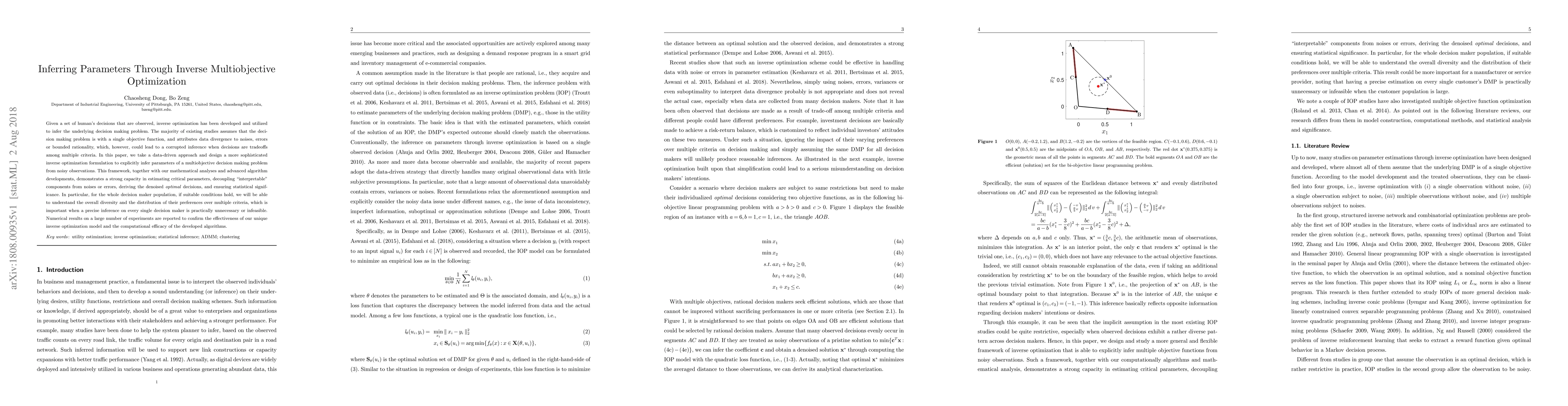 This paper proposes an advanced inverse optimization framework to infer parameters of multiobjective decision making problems from observed human decisions, addressing the limitations of single-objective models. The developed approach effectively estimates critical parameters, decouples interpretable components from noise, and ensures statistical significance, providing insights into the overall diversity and preference distribution among decision makers.