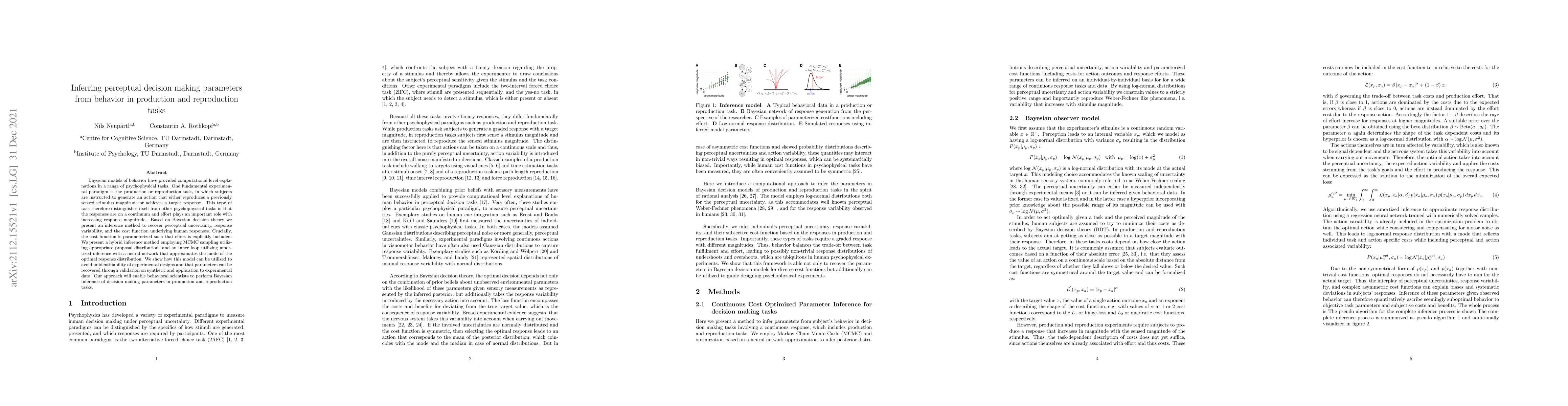 Bayesian models of behavior have provided computational level explanations in a range of psychophysical tasks. One fundamental experimental paradigm is the production or reproduction task, in which subjects are instructed to generate an action that either reproduces a previously sensed stimulus magnitude or achieves a target response. This type of task therefore distinguishes itself from other psychophysical tasks in that the responses are on a continuum and effort plays an important role with increasing response magnitude. Based on Bayesian decision theory we present an inference method to recover perceptual uncertainty, response variability, and the cost function underlying human responses. Crucially, the cost function is parameterized such that effort is explicitly included. We present a hybrid inference method employing MCMC sampling utilizing appropriate proposal distributions and an inner loop utilizing amortized inference with a neural network that approximates the mode of the optimal response distribution. We show how this model can be utilized to avoid unidentifiability of experimental designs and that parameters can be recovered through validation on synthetic and application to experimental data. Our approach will enable behavioral scientists to perform Bayesian inference of decision making parameters in production and reproduction tasks.
