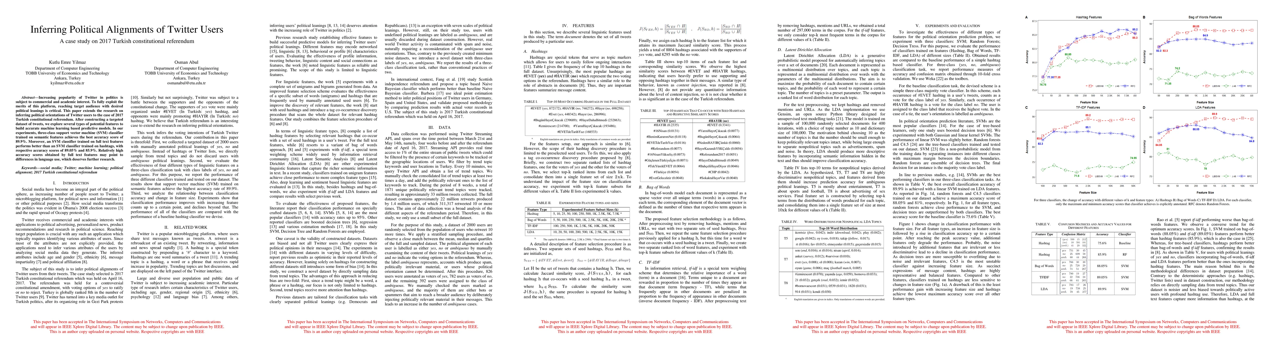 This paper investigates methods to infer political alignments of Twitter users during the 2017 Turkish constitutional referendum using machine learning. A three-class SVM classifier trained on semantic features achieved an accuracy of 89.9%, with full-text features yielding 89.05% accuracy, outperforming hashtag-based features.