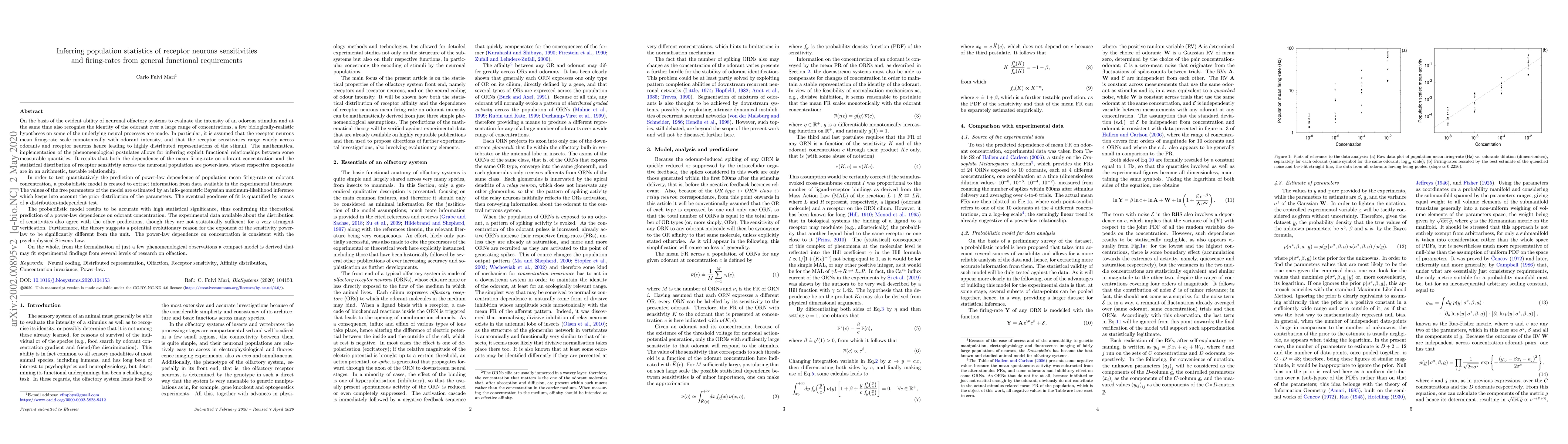 On the basis of the evident ability of neuronal olfactory systems to evaluate the intensity of an odorous stimulus and at the same time also recognise the identity of the odorant over a large range of concentrations, a few biologically-realistic hypotheses on some of the underlying neural processes are made. In particular, it is assumed that the receptor neurons mean firing-rate scale monotonically with odorant intensity, and that the receptor sensitivities range widely across odorants and receptor neurons hence leading to highly distributed representations of the stimuli. The mathematical implementation of the phenomenological postulates allows for inferring explicit functional relationships between some measurable quantities. It results that both the dependence of the mean firing-rate on odorant concentration and the statistical distribution of receptor sensitivity across the neuronal population are power-laws, whose respective exponents are in an arithmetic, testable relationship. In order to test quantitatively the prediction of power-law dependence of population mean firing-rate on odorant concentration, a probabilistic model is created to extract information from data available in the experimental literature. The values of the free parameters of the model are estimated by an info-geometric Bayesian maximum-likelihood inference which keeps into account the prior distribution of the parameters. The eventual goodness of fit is quantified by means of a distribution-independent test. [CONTINUES]