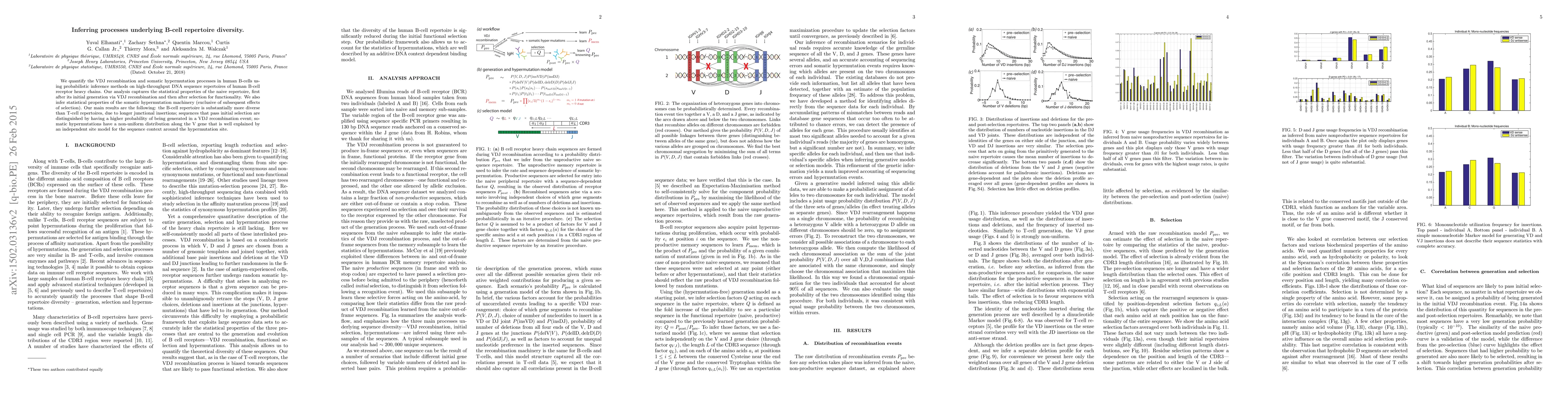 This paper uses probabilistic inference to analyze the VDJ recombination and somatic hypermutation processes in human B-cells, revealing that B-cell repertoires are more diverse than T-cell repertoires due to longer junctional insertions and a non-uniform distribution of somatic hypermutations along the V gene.
