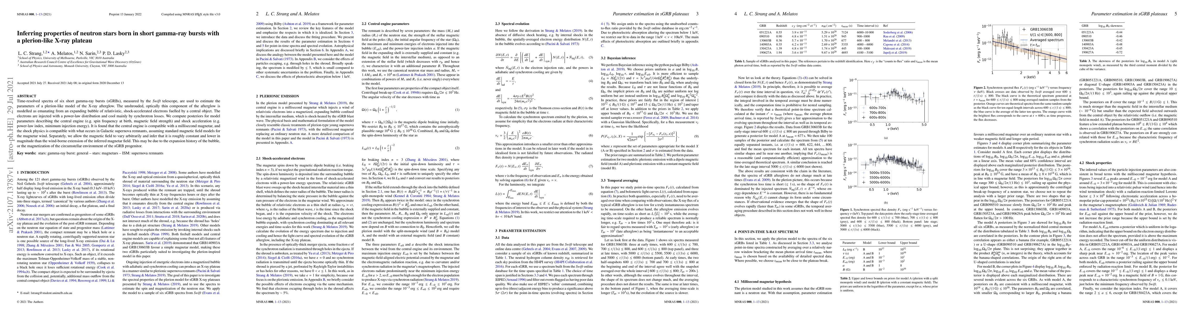 Time-resolved spectra of six short gamma-ray bursts (sGRBs), measured by the {\em Swift} telescope, are used to estimate the parameters of a plerion-like model of the X-ray afterglow. The unshrouded, optically thin component of the afterglow is modelled as emanating from an expanding bubble of relativistic, shock-accelerated electrons fuelled by a central object. The electrons are injected with a power-law distribution and cool mainly by synchrotron losses. We compute posteriors for model parameters describing the central engine (e.g. spin frequency at birth, magnetic field strength) and shock acceleration (e.g. power-law index, minimum injection energy). It is found that the central engine is compatible with a millisecond magnetar, and the shock physics is compatible with what occurs in Galactic supernova remnants, assuming standard magnetic field models for the magnetar wind. Separately, we allow the magnetic field to vary arbitrarily and infer that it is roughly constant and lower in magnitude than the wind-borne extension of the inferred magnetar field. This may be due to the expansion history of the bubble, or the magnetization of the circumstellar environment of the sGRB progenitor.