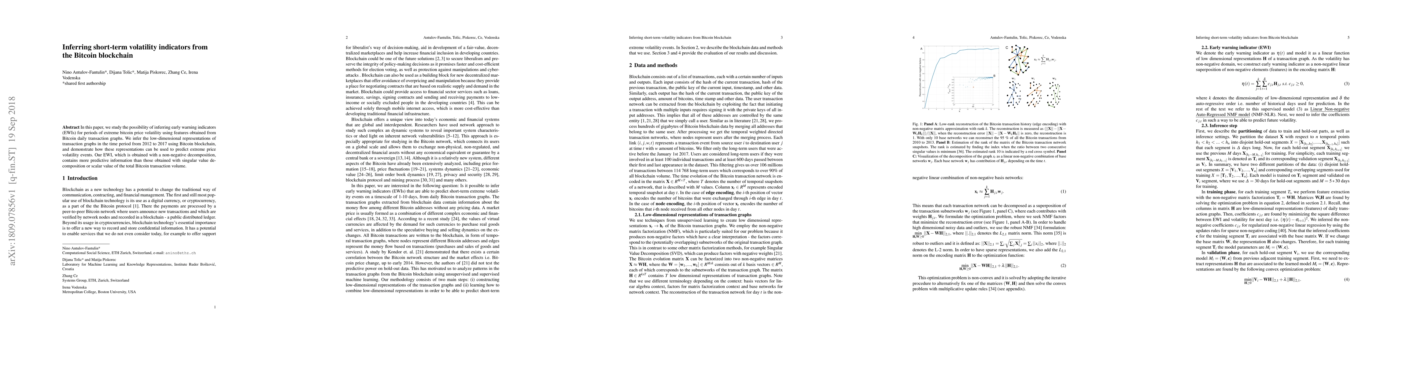 In this paper, we study the possibility of inferring early warning indicators (EWIs) for periods of extreme bitcoin price volatility using features obtained from Bitcoin daily transaction graphs. We infer the low-dimensional representations of transaction graphs in the time period from 2012 to 2017 using Bitcoin blockchain, and demonstrate how these representations can be used to predict extreme price volatility events. Our EWI, which is obtained with a non-negative decomposition, contains more predictive information than those obtained with singular value decomposition or scalar value of the total Bitcoin transaction volume.