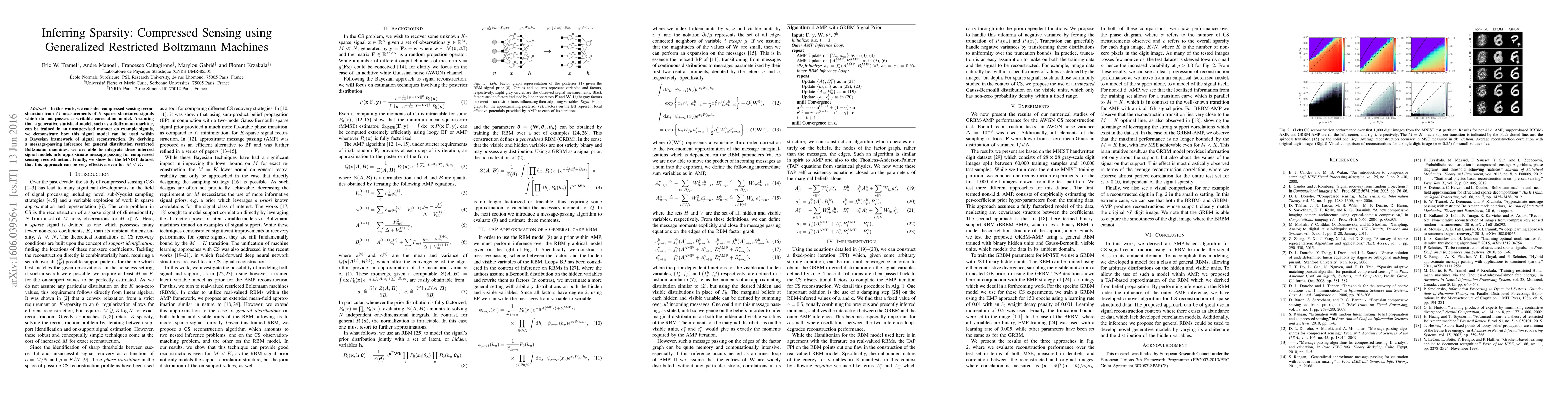 In this work, we consider compressed sensing reconstruction from $M$ measurements of $K$-sparse structured signals which do not possess a writable correlation model. Assuming that a generative statistical model, such as a Boltzmann machine, can be trained in an unsupervised manner on example signals, we demonstrate how this signal model can be used within a Bayesian framework of signal reconstruction. By deriving a message-passing inference for general distribution restricted Boltzmann machines, we are able to integrate these inferred signal models into approximate message passing for compressed sensing reconstruction. Finally, we show for the MNIST dataset that this approach can be very effective, even for $M < K$.