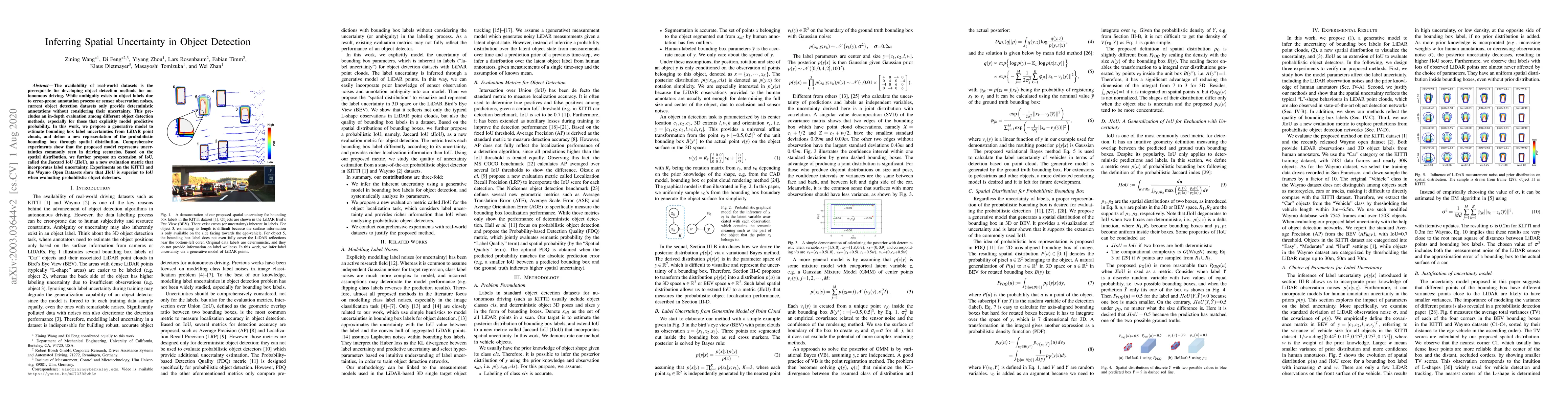 The availability of real-world datasets is the prerequisite for developing object detection methods for autonomous driving. While ambiguity exists in object labels due to error-prone annotation process or sensor observation noises, current object detection datasets only provide deterministic annotations without considering their uncertainty. This precludes an in-depth evaluation among different object detection methods, especially for those that explicitly model predictive probability. In this work, we propose a generative model to estimate bounding box label uncertainties from LiDAR point clouds, and define a new representation of the probabilistic bounding box through spatial distribution. Comprehensive experiments show that the proposed model represents uncertainties commonly seen in driving scenarios. Based on the spatial distribution, we further propose an extension of IoU, called the Jaccard IoU (JIoU), as a new evaluation metric that incorporates label uncertainty. Experiments on the KITTI and the Waymo Open Datasets show that JIoU is superior to IoU when evaluating probabilistic object detectors.