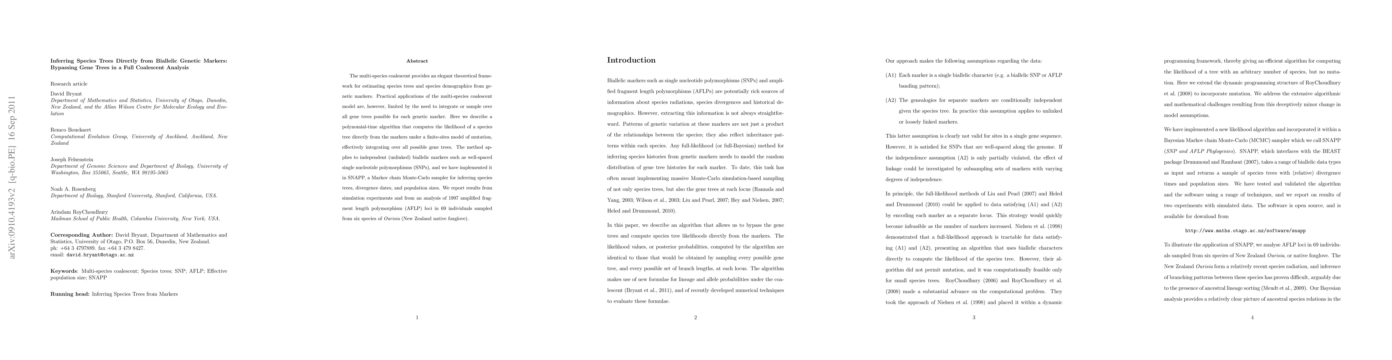 This paper introduces a polynomial-time algorithm to directly infer species trees from biallelic genetic markers without needing to integrate over gene trees, implemented in SNAPP. It demonstrates the method's effectiveness through simulations and an analysis of AFLP loci in New Zealand native foxglove species.