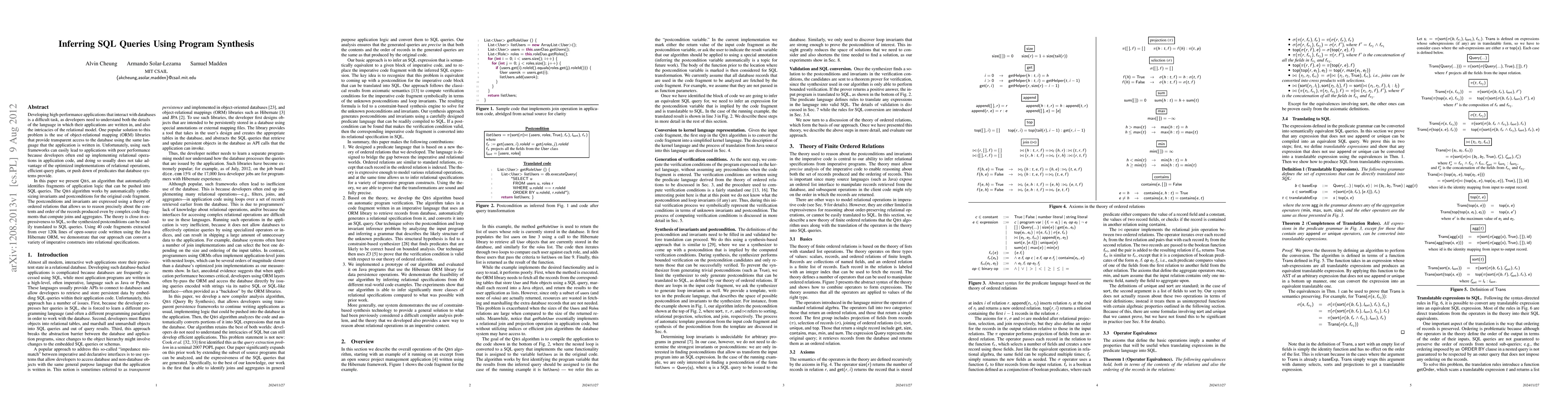 This paper introduces QBS, an algorithm that automatically infers SQL queries from application logic, aiming to improve database interaction performance by leveraging database optimizations. The QBS algorithm synthesizes invariants and postconditions to precisely reason about code fragments, translating them into SQL queries using a theory of ordered relations.