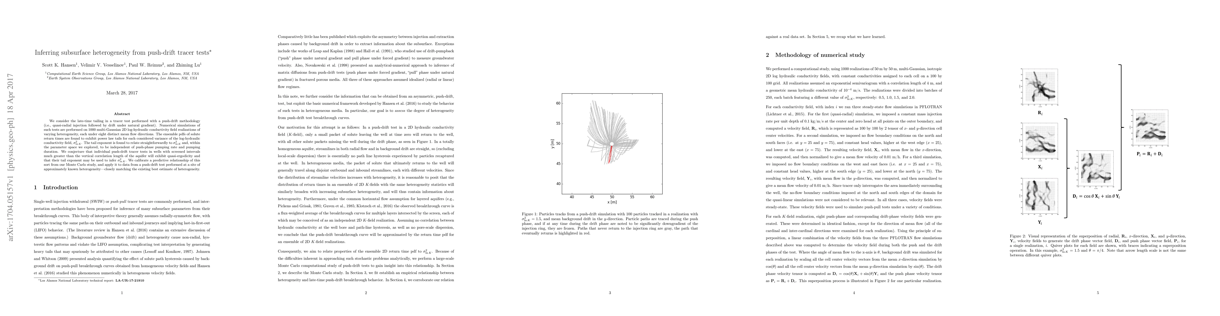 We consider the late-time tailing in a tracer test performed with a push-drift methodology (i.e., quasi-radial injection followed by drift under natural gradient). Numerical simulations of such tests are performed on 1000 multi-Gaussian 2D log-hydraulic conductivity field realizations of varying heterogeneity, each under eight distinct mean flow directions. The ensemble pdfs of solute return times are found to exhibit power law tails for each considered variance of the log-hydraulic conductivity field, $\sigma^2_{\ln K}$. The tail exponent is found to relate straightforwardly to $\sigma^2_{\ln K}$ and, within the parameter space we explored, to be independent of push-phase pumping rate and pumping duration. We conjecture that individual push-drift tracer tests in wells with screened intervals much greater than the vertical correlation length of the aquifer will exhibit quasi-ergodicity and that their tail exponent may be used to infer $\sigma^2_{\ln K}$. We calibrate a predictive relationship of this sort from our Monte Carlo study, and apply it to data from a push-drift test performed at a site of approximately known heterogeneity---closely matching the existing best estimate of heterogeneity.
