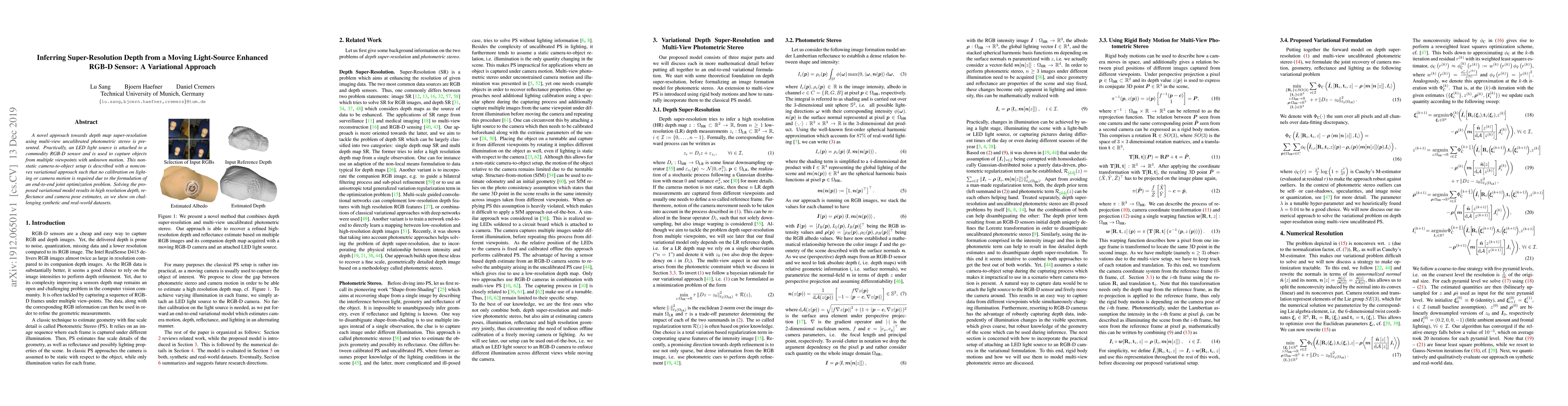 This paper proposes a novel variational approach for super-resolving depth maps using an RGB-D sensor enhanced with a moving LED light source. The method optimizes depth, reflectance, and camera pose without requiring calibration, achieving high-resolution results on synthetic and real datasets.
