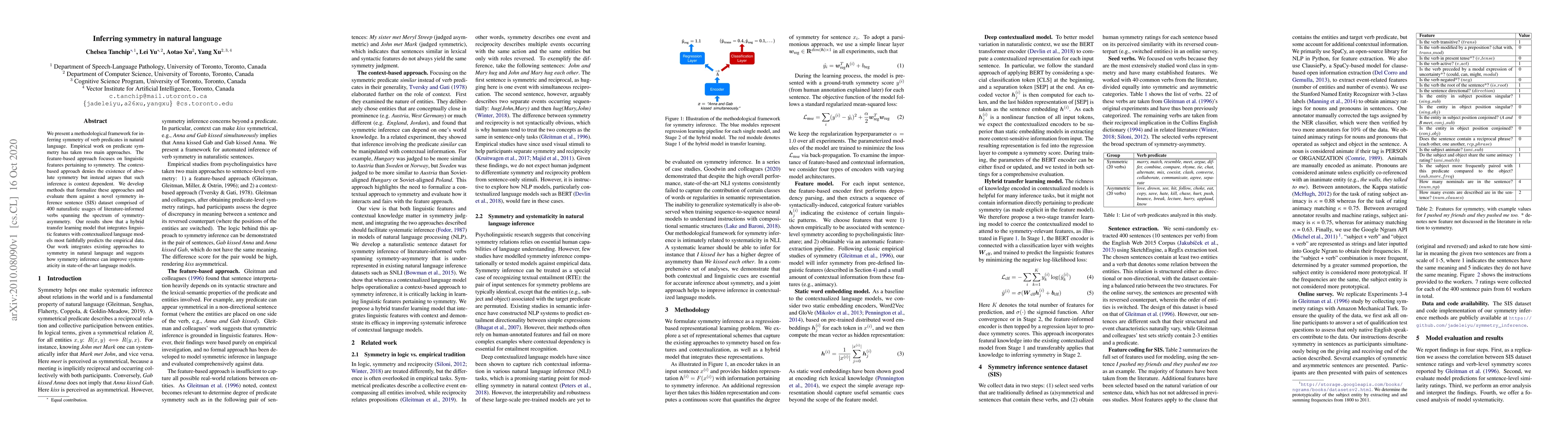 We present a methodological framework for inferring symmetry of verb predicates in natural language. Empirical work on predicate symmetry has taken two main approaches. The feature-based approach focuses on linguistic features pertaining to symmetry. The context-based approach denies the existence of absolute symmetry but instead argues that such inference is context dependent. We develop methods that formalize these approaches and evaluate them against a novel symmetry inference sentence (SIS) dataset comprised of 400 naturalistic usages of literature-informed verbs spanning the spectrum of symmetry-asymmetry. Our results show that a hybrid transfer learning model that integrates linguistic features with contextualized language models most faithfully predicts the empirical data. Our work integrates existing approaches to symmetry in natural language and suggests how symmetry inference can improve systematicity in state-of-the-art language models.