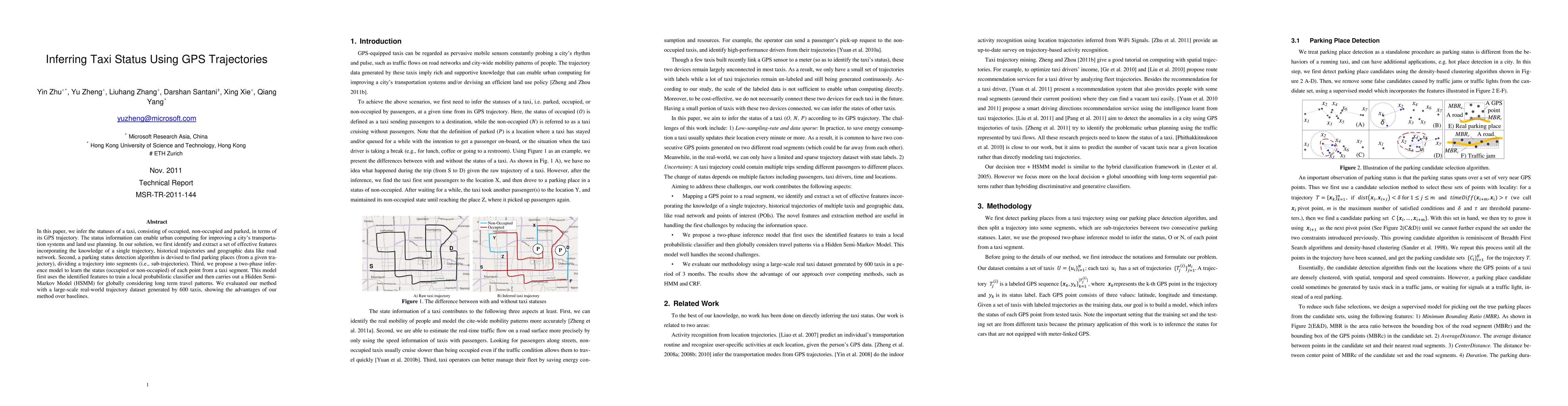 This work is different from existing research in that it uses a combination of local features and global travel patterns for accurate taxi status inference