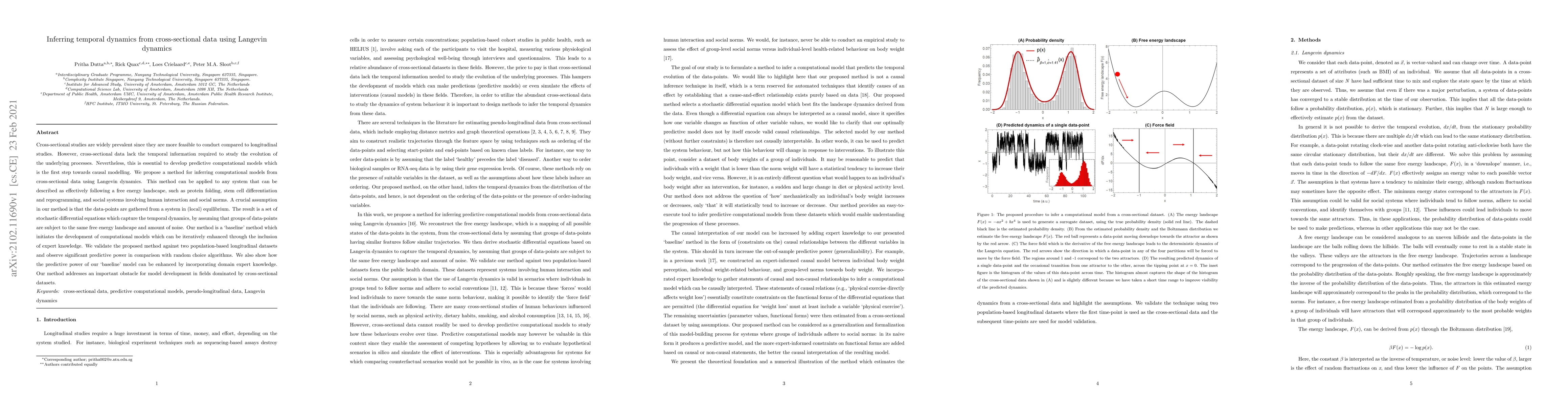 Cross-sectional studies are widely prevalent since they are more feasible to conduct compared to longitudinal studies. However, cross-sectional data lack the temporal information required to study the evolution of the underlying processes. Nevertheless, this is essential to develop predictive computational models which is the first step towards causal modelling. We propose a method for inferring computational models from cross-sectional data using Langevin dynamics. This method can be applied to any system that can be described as effectively following a free energy landscape, such as protein folding, stem cell differentiation and reprogramming, and social systems involving human interaction and social norms. A crucial assumption in our method is that the data-points are gathered from a system in (local) equilibrium. The result is a set of stochastic differential equations which capture the temporal dynamics, by assuming that groups of data-points are subject to the same free energy landscape and amount of noise. Our method is a 'baseline' method which initiates the development of computational models which can be iteratively enhanced through the inclusion of expert knowledge. We validate the proposed method against two population-based longitudinal datasets and observe significant predictive power in comparison with random choice algorithms. We also show how the predictive power of our 'baseline' model can be enhanced by incorporating domain expert knowledge. Our method addresses an important obstacle for model development in fields dominated by cross-sectional datasets.