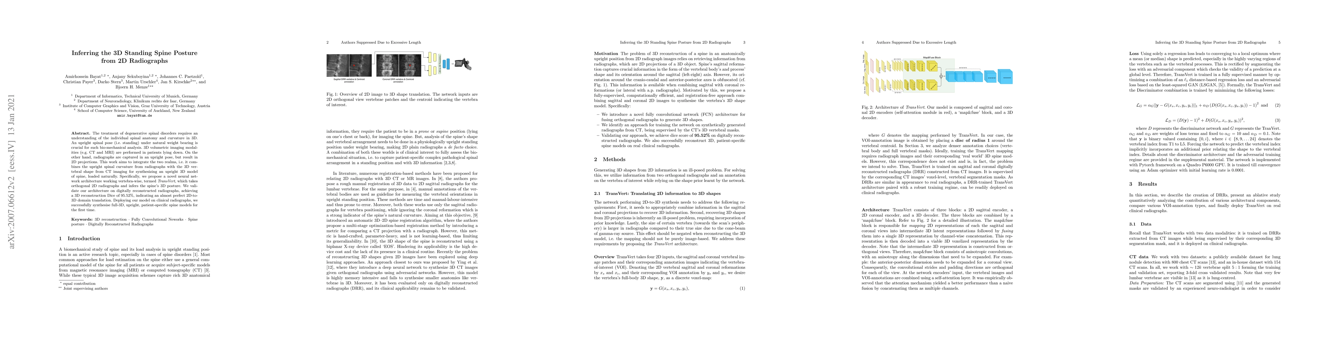 The treatment of degenerative spinal disorders requires an understanding of the individual spinal anatomy and curvature in 3D. An upright spinal pose (i.e. standing) under natural weight bearing is crucial for such bio-mechanical analysis. 3D volumetric imaging modalities (e.g. CT and MRI) are performed in patients lying down. On the other hand, radiographs are captured in an upright pose, but result in 2D projections. This work aims to integrate the two realms, i.e. it combines the upright spinal curvature from radiographs with the 3D vertebral shape from CT imaging for synthesizing an upright 3D model of spine, loaded naturally. Specifically, we propose a novel neural network architecture working vertebra-wise, termed \emph{TransVert}, which takes orthogonal 2D radiographs and infers the spine's 3D posture. We validate our architecture on digitally reconstructed radiographs, achieving a 3D reconstruction Dice of $95.52\%$, indicating an almost perfect 2D-to-3D domain translation. Deploying our model on clinical radiographs, we successfully synthesise full-3D, upright, patient-specific spine models for the first time.