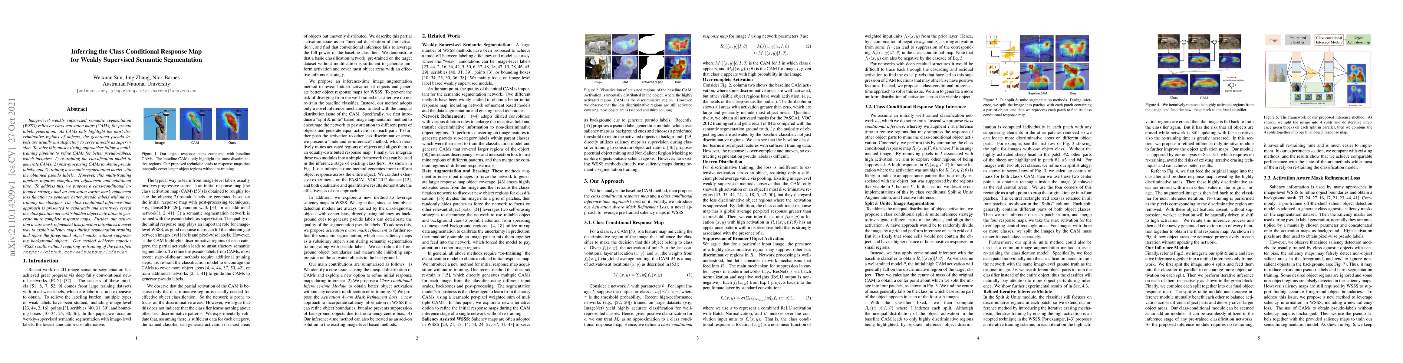This paper proposes a class-conditional inference strategy and an activation aware mask refinement loss to generate improved pseudo labels for weakly supervised semantic segmentation, eliminating the need for re-training the classifier and simplifying the multi-training pipeline. The method iteratively reveals hidden object activations and refines object masks without suppressing background objects, achieving superior segmentation results.