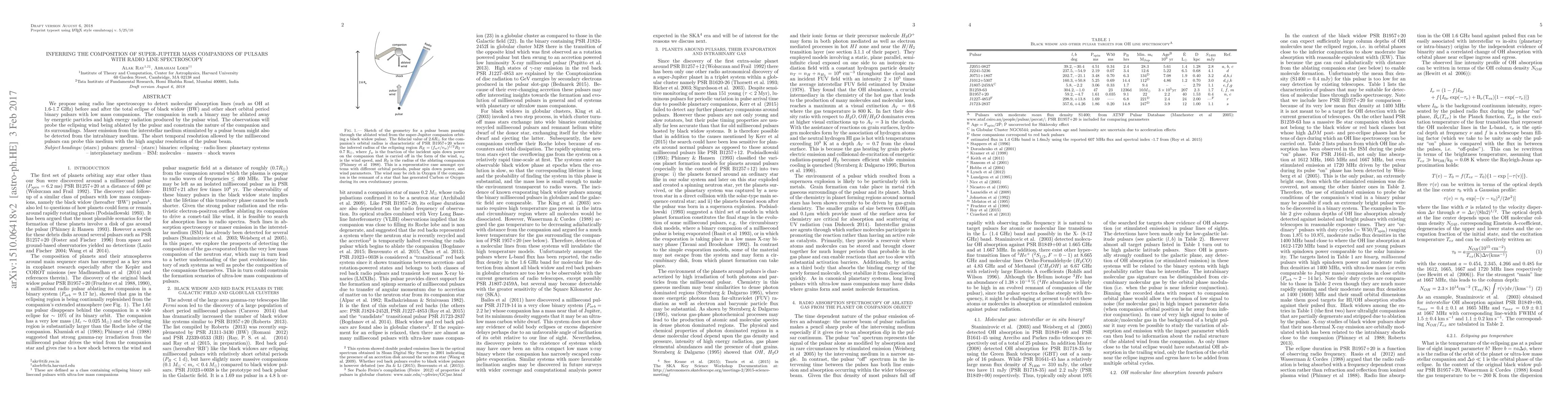 This research proposes using radio line spectroscopy to detect molecular absorption lines before and after the eclipse of short orbital period binary pulsars, aiming to infer the composition of their super-Jupiter mass companions. The study seeks to probe the pulsar wind's effect on the companion and potentially detect maser emissions from the intrabinary medium.
