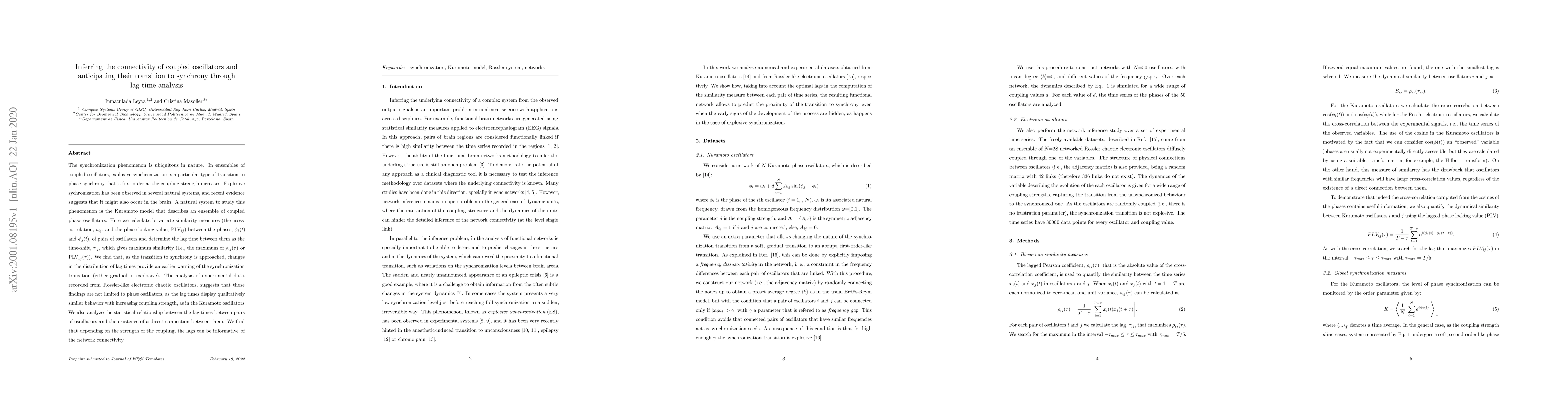 The synchronization phenomenon is ubiquitous in nature. In ensembles of coupled oscillators, explosive synchronization is a particular type of transition to phase synchrony that is first-order as the coupling strength increases. Explosive sychronization has been observed in several natural systems, and recent evidence suggests that it might also occur in the brain. A natural system to study this phenomenon is the Kuramoto model that describes an ensemble of coupled phase oscillators. Here we calculate bi-variate similarity measures (the cross-correlation, $\rho_{ij}$, and the phase locking value, PLV$_{ij}$) between the phases, $\phi_i(t)$ and $\phi_j(t)$, of pairs of oscillators and determine the lag time between them as the time-shift, $\tau_{ij}$, which gives maximum similarity (i.e., the maximum of $\rho_{ij}(\tau)$ or PLV$_{ij}(\tau)$). We find that, as the transition to synchrony is approached, changes in the distribution of lag times provide an earlier warning of the synchronization transition (either gradual or explosive). The analysis of experimental data, recorded from Rossler-like electronic chaotic oscillators, suggests that these findings are not limited to phase oscillators, as the lag times display qualitatively similar behavior with increasing coupling strength, as in the Kuramoto oscillators. We also analyze the statistical relationship between the lag times between pairs of oscillators and the existence of a direct connection between them. We find that depending on the strength of the coupling, the lags can be informative of the network connectivity.