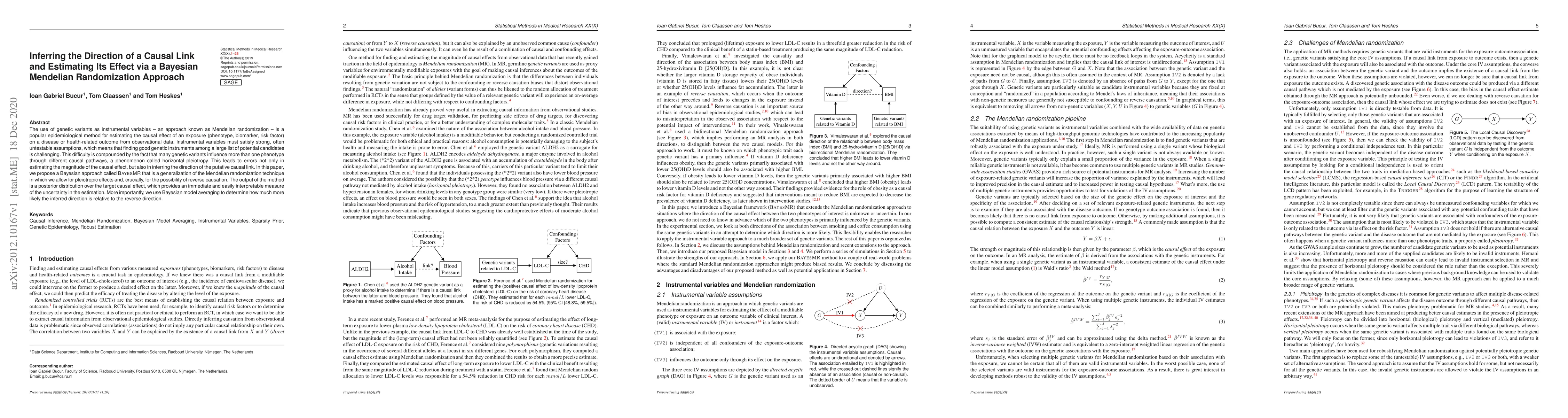 The use of genetic variants as instrumental variables - an approach known as Mendelian randomization - is a popular epidemiological method for estimating the causal effect of an exposure (phenotype, biomarker, risk factor) on a disease or health-related outcome from observational data. Instrumental variables must satisfy strong, often untestable assumptions, which means that finding good genetic instruments among a large list of potential candidates is challenging. This difficulty is compounded by the fact that many genetic variants influence more than one phenotype through different causal pathways, a phenomenon called horizontal pleiotropy. This leads to errors not only in estimating the magnitude of the causal effect but also in inferring the direction of the putative causal link. In this paper, we propose a Bayesian approach called BayesMR that is a generalization of the Mendelian randomization technique in which we allow for pleiotropic effects and, crucially, for the possibility of reverse causation. The output of the method is a posterior distribution over the target causal effect, which provides an immediate and easily interpretable measure of the uncertainty in the estimation. More importantly, we use Bayesian model averaging to determine how much more likely the inferred direction is relative to the reverse direction.