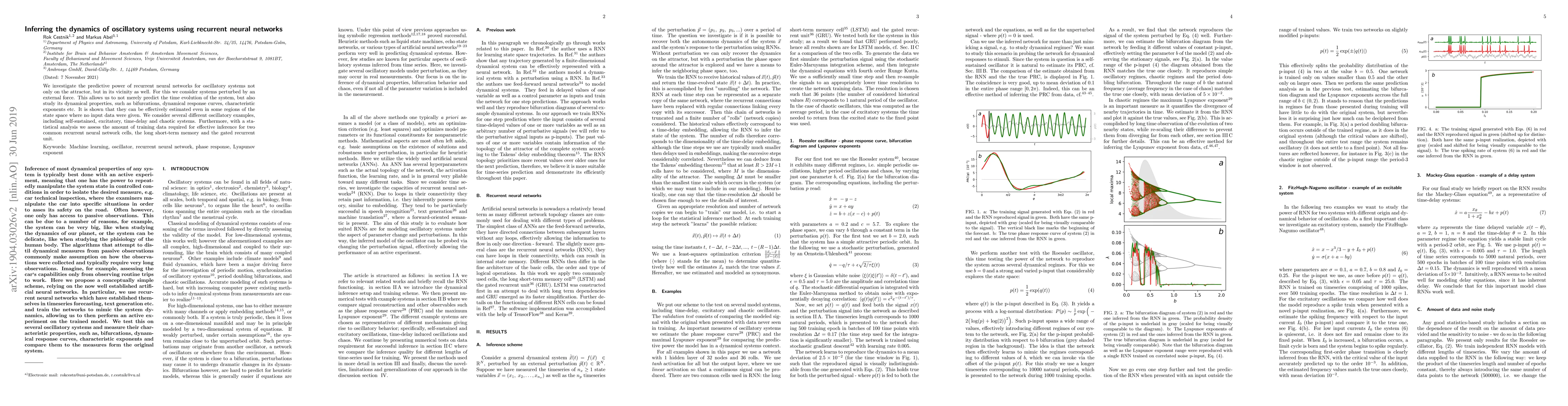 We investigate the predictive power of recurrent neural networks for oscillatory systems not only on the attractor, but in its vicinity as well. For this we consider systems perturbed by an external force. This allows us to not merely predict the time evolution of the system, but also study its dynamical properties, such as bifurcations, dynamical response curves, characteristic exponents etc. It is shown that they can be effectively estimated even in some regions of the state space where no input data were given. We consider several different oscillatory examples, including self-sustained, excitatory, time-delay and chaotic systems. Furthermore, with a statistical analysis we assess the amount of training data required for effective inference for two common recurrent neural network cells, the long short-term memory and the gated recurrent unit.