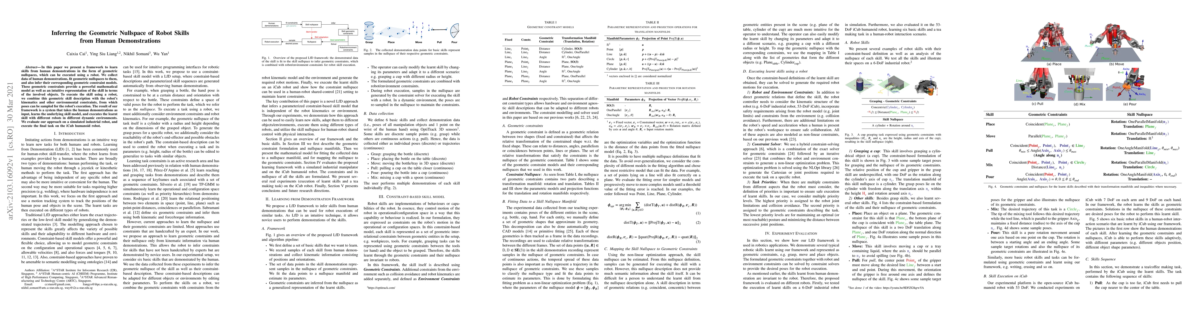 This paper introduces a framework for learning robot skills from human demonstrations by inferring geometric nullspaces and constraint models. It combines these with the robot's kinematics to execute the skill dynamically in various environments, demonstrated on both a simulated industrial robot and the iCub humanoid robot.