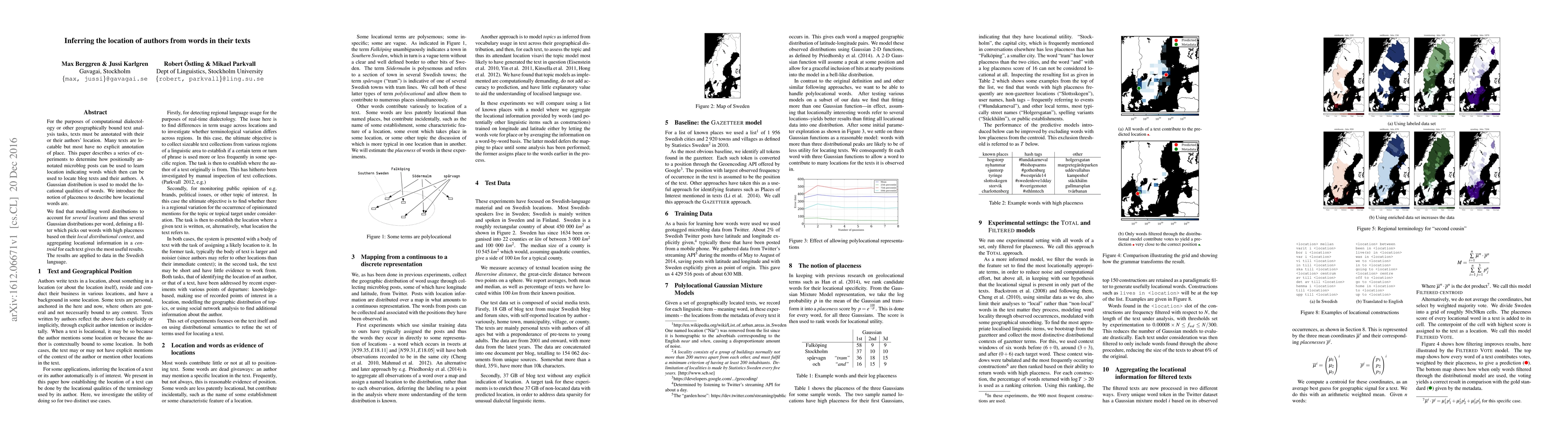 For the purposes of computational dialectology or other geographically bound text analysis tasks, texts must be annotated with their or their authors' location. Many texts are locatable through explicit labels but most have no explicit annotation of place. This paper describes a series of experiments to determine how positionally annotated microblog posts can be used to learn location-indicating words which then can be used to locate blog texts and their authors. A Gaussian distribution is used to model the locational qualities of words. We introduce the notion of placeness to describe how locational words are. We find that modelling word distributions to account for several locations and thus several Gaussian distributions per word, defining a filter which picks out words with high placeness based on their local distributional context, and aggregating locational information in a centroid for each text gives the most useful results. The results are applied to data in the Swedish language.