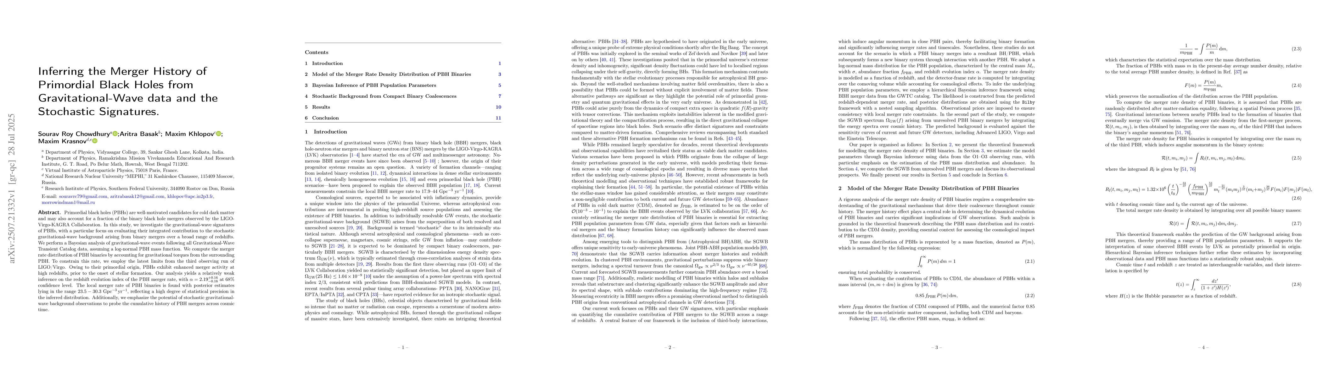 Primordial black holes (PBHs) are well-motivated candidates for cold dark matter and may also account for a fraction of the binary black hole mergers observed by the LIGO-Virgo-KAGRA Collaboration. In this study, we investigate the gravitational-wave signatures of PBHs, with a particular focus on evaluating their integrated contribution to the stochastic gravitational-wave background arising from binary mergers over a broad range of redshifts. We perform a Bayesian analysis of gravitational-wave events following all Gravitational-Wave Transient Catalog data, assuming a log-normal PBH mass function. We compute the merger rate distribution of PBH binaries by accounting for gravitational torques from the surrounding PBH. To constrain this rate, we employ the latest limits from the third observing run of LIGO/Virgo. Owing to their primordial origin, PBHs exhibit enhanced merger activity at high redshifts, prior to the onset of stellar formation. Our analysis yields a relatively weak inference on the redshift evolution index of the PBH merger rate, with $\alpha = 2.19^{+0.16}_{-0.16}$ at 68\% confidence level. The local merger rate of PBH binaries is found with posterior estimates lying in the range $23.5-30.3~\mathrm{Gpc}^{-3}\,\mathrm{yr}^{-1}$, reflecting a high degree of statistical precision in the inferred distribution. Additionally, we emphasize the potential of stochastic gravitational-wave background observations to probe the cumulative history of PBH mergers across cosmic time.