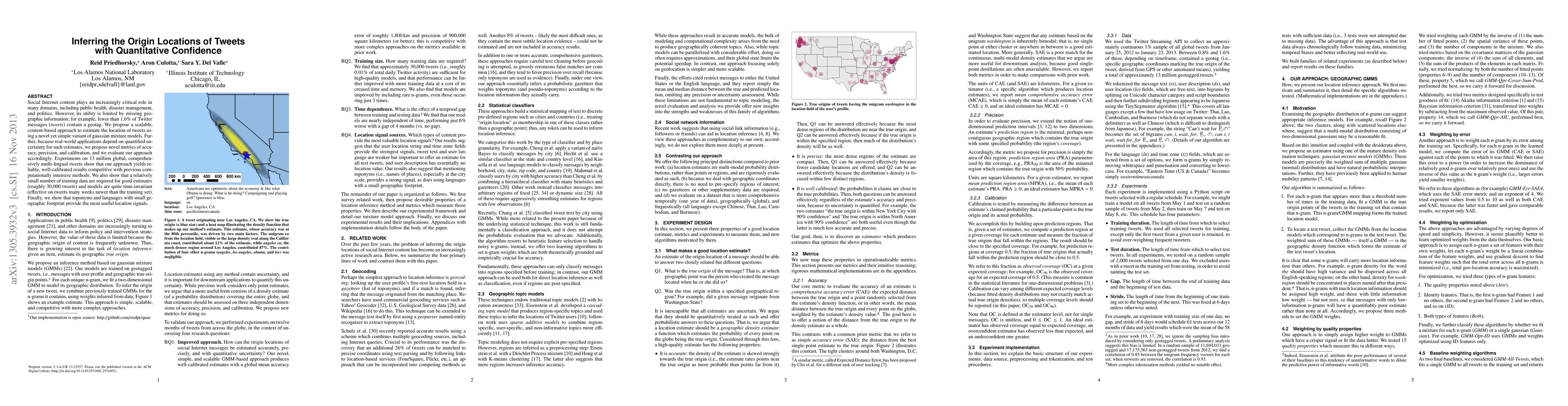 This paper proposes a scalable content-based method to infer the origin locations of tweets using a variant of gaussian mixture models, achieving reliable results with quantified uncertainty metrics. Experiments demonstrate competitive accuracy with minimal training data and time-invariant model effectiveness.