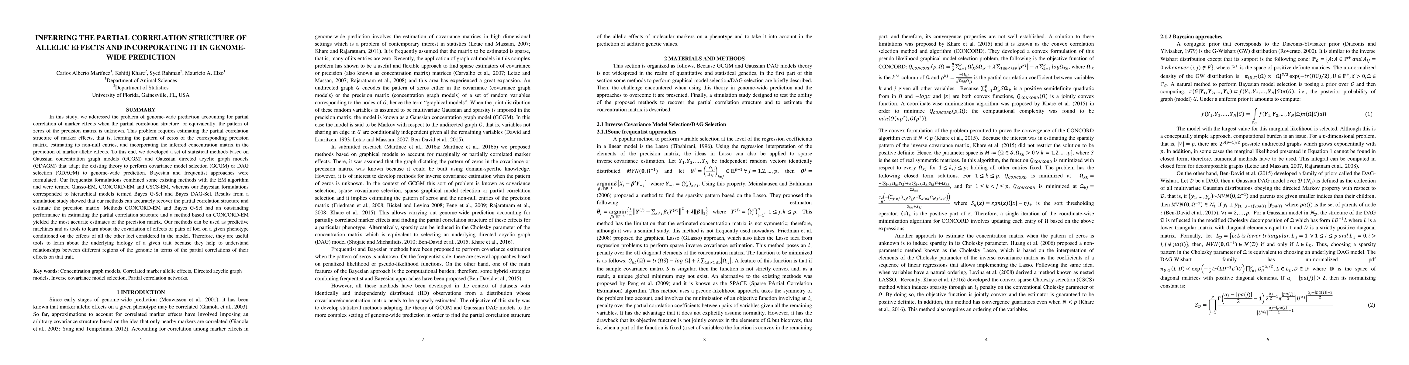 This paper develops statistical methods to infer the partial correlation structure of allelic effects in genome-wide prediction, employing Gaussian concentration graph models and directed acyclic graph models. The proposed methods, including Glasso-EM, CONCORD-EM, and CSCS-EM, accurately recover the partial correlation structure and improve the prediction of allelic effects.