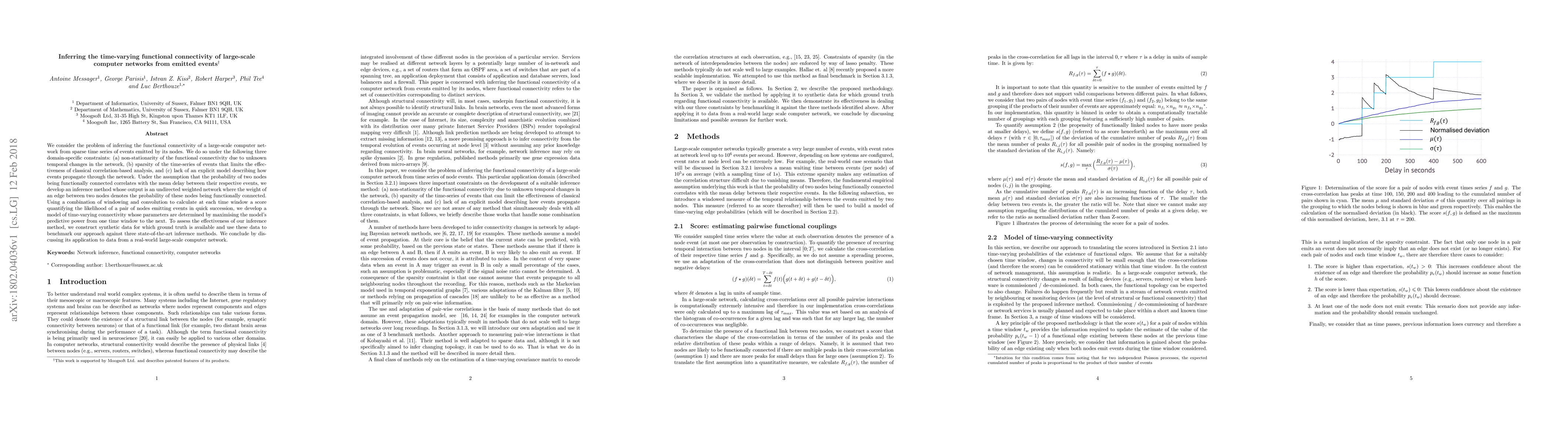 We consider the problem of inferring the functional connectivity of a large-scale computer network from sparse time series of events emitted by its nodes. We do so under the following three domain-specific constraints: (a) non-stationarity of the functional connectivity due to unknown temporal changes in the network, (b) sparsity of the time-series of events that limits the effectiveness of classical correlation-based analysis, and (c) lack of an explicit model describing how events propagate through the network. Under the assumption that the probability of two nodes being functionally connected correlates with the mean delay between their respective events, we develop an inference method whose output is an undirected weighted network where the weight of an edge between two nodes denotes the probability of these nodes being functionally connected. Using a combination of windowing and convolution to calculate at each time window a score quantifying the likelihood of a pair of nodes emitting events in quick succession, we develop a model of time-varying connectivity whose parameters are determined by maximising the model's predictive power from one time window to the next. To assess the effectiveness of our inference method, we construct synthetic data for which ground truth is available and use these data to benchmark our approach against three state-of-the-art inference methods. We conclude by discussing its application to data from a real-world large-scale computer network.