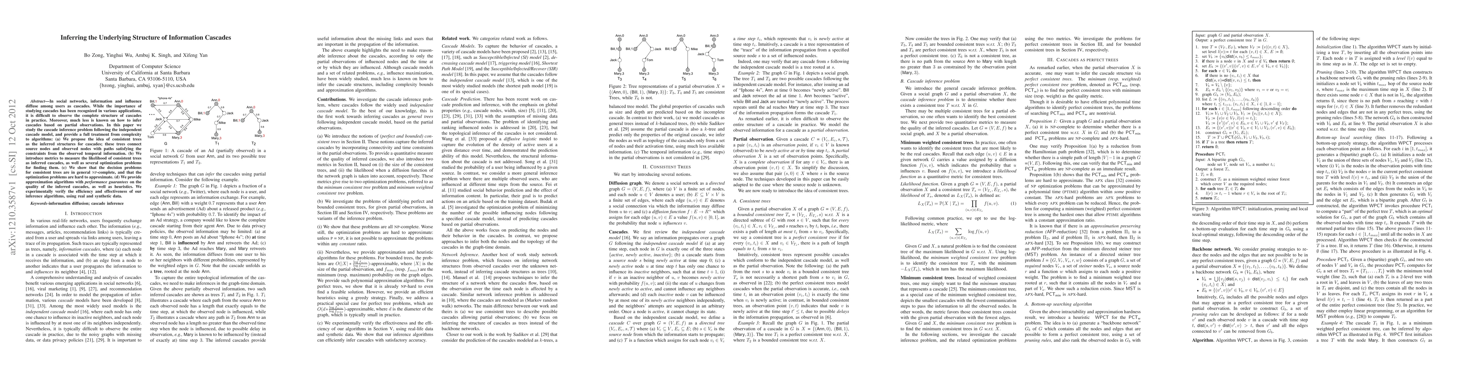 This paper develops methods for inferring the underlying structure of information cascades in social networks, proposing consistent trees to represent inferred cascades based on partial observations. It presents metrics and optimization problems for finding these structures, discusses their computational complexity, and offers approximation algorithms and heuristics, validated through experiments on both real and synthetic data.