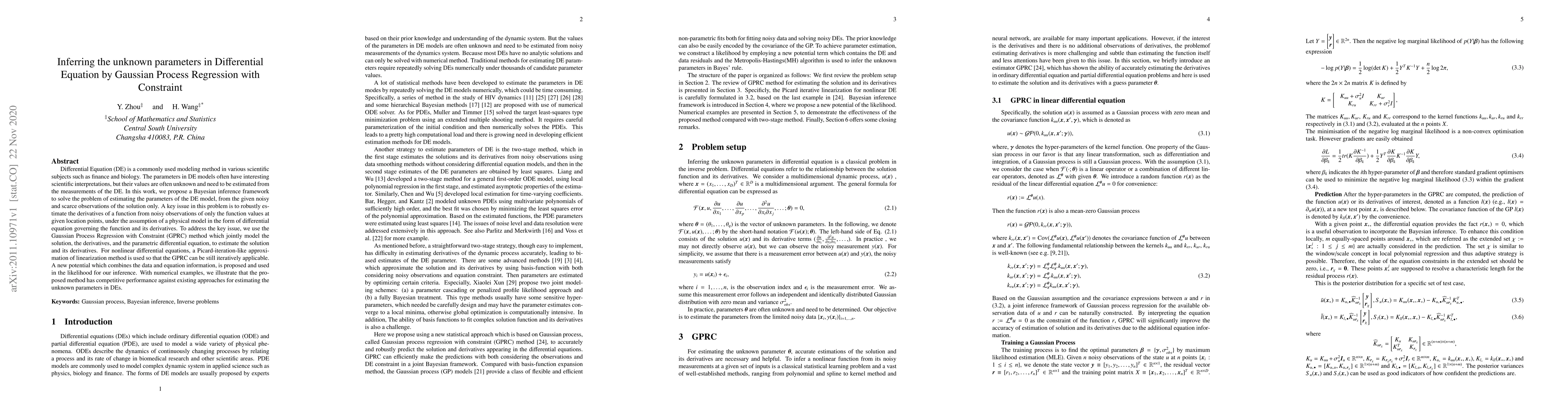 This paper proposes a Bayesian inference framework using Gaussian Process Regression with Constraint (GPRC) to estimate unknown parameters in Differential Equation models from noisy and sparse observations. The method jointly models the solution and its derivatives, employing a linearization technique for nonlinear equations, and demonstrates competitive performance through numerical examples.