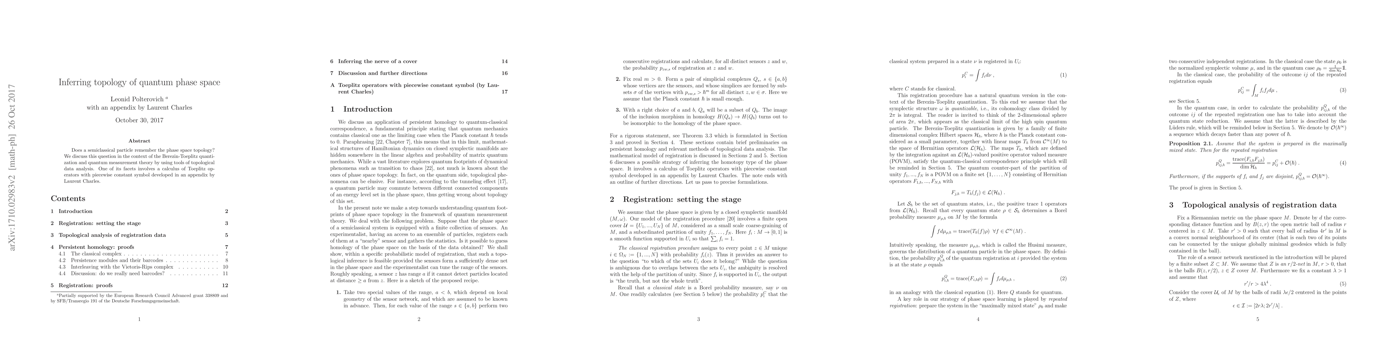 Does a semiclassical particle remember the phase space topology? We discuss this question in the context of the Berezin-Toeplitz quantization and quantum measurement theory by using tools of topological data analysis. One of its facets involves a calculus of Toeplitz operators with piecewise constant symbol developed in an appendix by Laurent Charles.