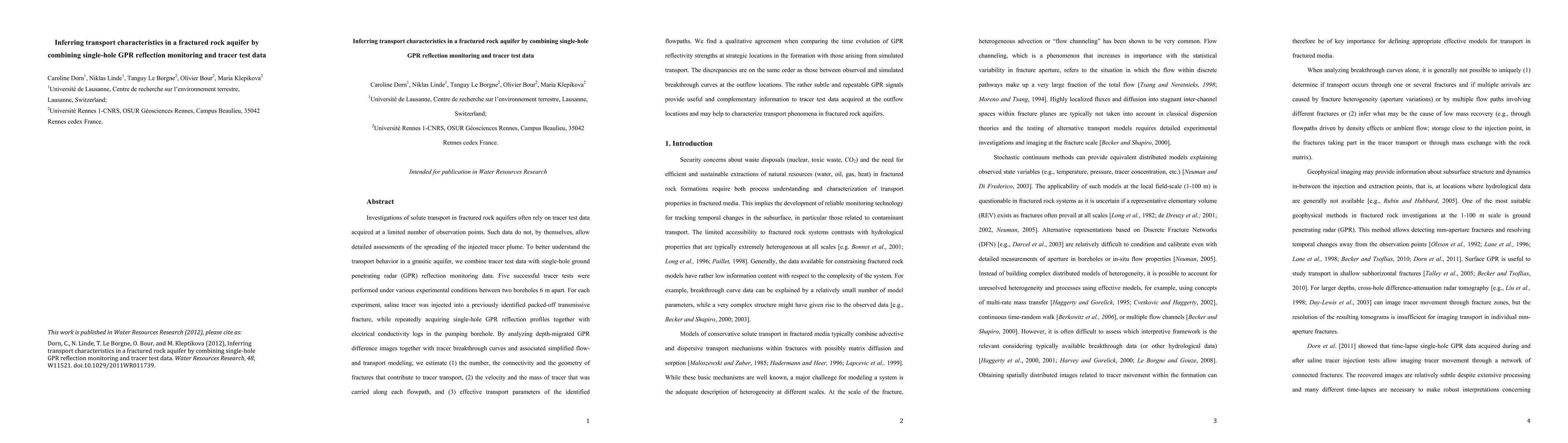 This study combines single-hole GPR reflection monitoring with tracer test data to infer transport characteristics in a fractured rock aquifer. The research estimates the number, connectivity, and geometry of contributing fractures, tracer velocities, and effective transport parameters, finding that GPR data provide complementary insights to outflow tracer data.