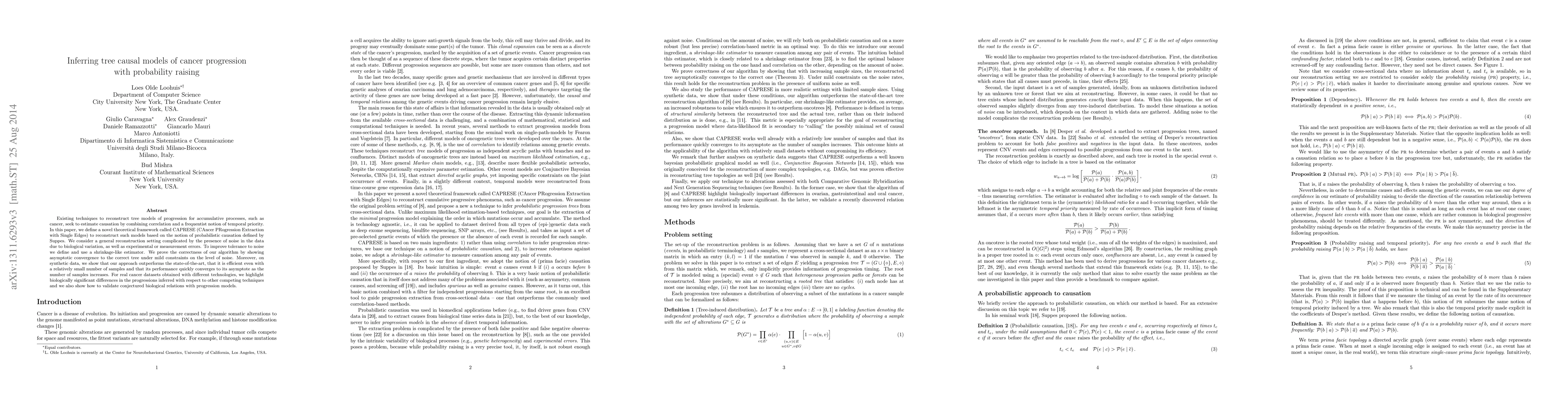 A new method called CAPRESE is introduced to infer tree causal models of cancer progression with probability raising, which outperforms existing techniques on synthetic and real data, and can validate biological relations.