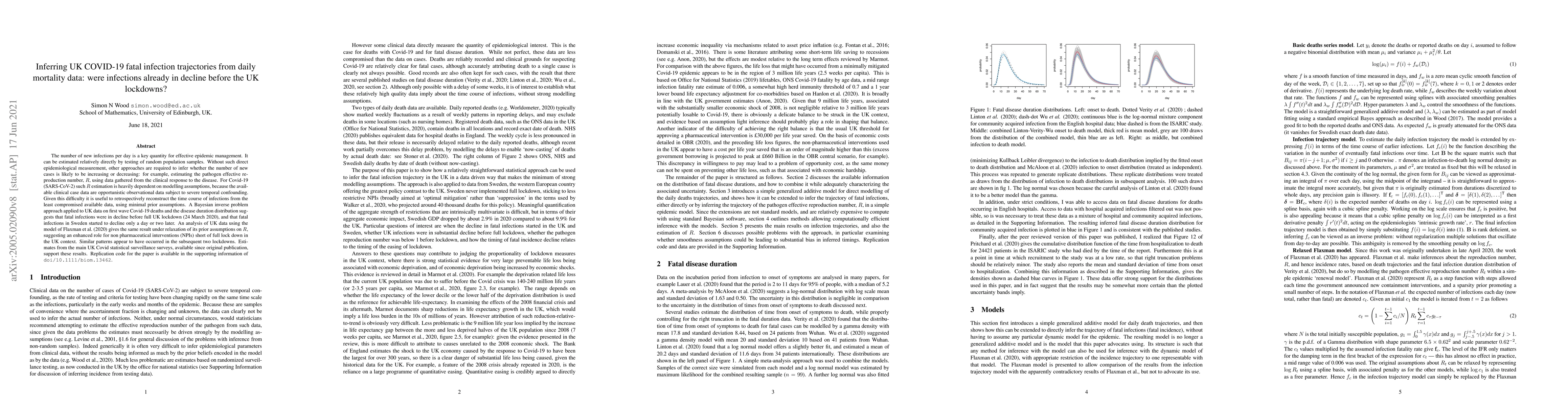 The number of new infections per day is a key quantity for effective epidemic management. It can be estimated relatively directly by testing of random population samples. Without such direct epidemiological measurement, other approaches are required to infer whether the number of new cases is likely to be increasing or decreasing: for example, estimating the pathogen effective reproduction number, R, using data gathered from the clinical response to the disease. For Covid-19 (SARS-CoV-2) such R estimation is heavily dependent on modelling assumptions, because the available clinical case data are opportunistic observational data subject to severe temporal confounding. Given this difficulty it is useful to retrospectively reconstruct the time course of infections from the least compromised available data, using minimal prior assumptions. A Bayesian inverse problem approach applied to UK data on first wave Covid-19 deaths and the disease duration distribution suggests that fatal infections were in decline before full UK lockdown (24 March 2020), and that fatal infections in Sweden started to decline only a day or two later. An analysis of UK data using the model of Flaxman et al. (2020, Nature 584) gives the same result under relaxation of its prior assumptions on R, suggesting an enhanced role for non pharmaceutical interventions (NPIs) short of full lock down in the UK context. Similar patterns appear to have occurred in the subsequent two lockdowns. Estimates from the main UK Covid statistical surveillance surveys, available since original publication, support these results. Replication code for the paper is available in the supporting information of doi/10.1111/biom.13462.