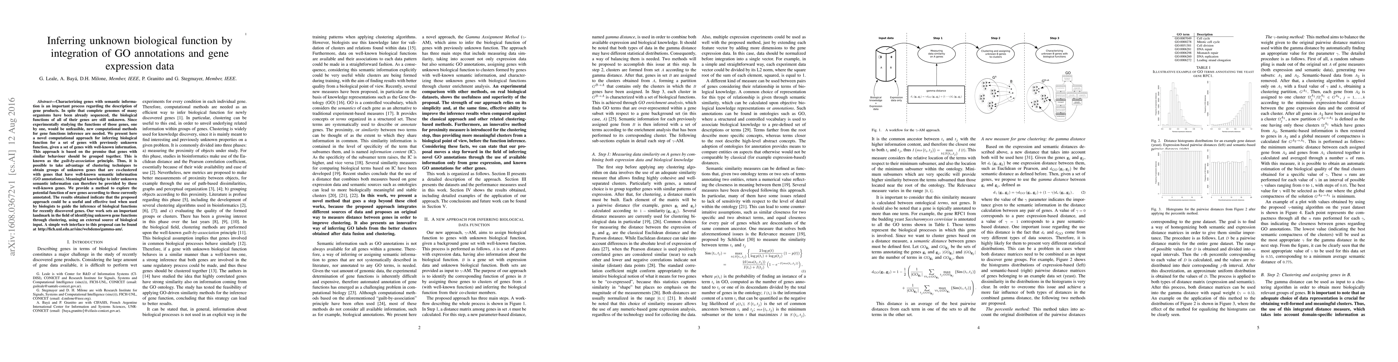 Characterizing genes with semantic information is an important process regarding the description of gene products. In spite that complete genomes of many organisms have been already sequenced, the biological functions of all of their genes are still unknown. Since experimentally studying the functions of those genes, one by one, would be unfeasible, new computational methods for gene functions inference are needed. We present here a novel computational approach for inferring biological function for a set of genes with previously unknown function, given a set of genes with well-known information. This approach is based on the premise that genes with similar behaviour should be grouped together. This is known as the guilt-by-association principle. Thus, it is possible to take advantage of clustering techniques to obtain groups of unknown genes that are co-clustered with genes that have well-known semantic information (GO annotations). Meaningful knowledge to infer unknown semantic information can therefore be provided by these well-known genes. We provide a method to explore the potential function of new genes according to those currently annotated. The results obtained indicate that the proposed approach could be a useful and effective tool when used by biologists to guide the inference of biological functions for recently discovered genes. Our work sets an important landmark in the field of identifying unknown gene functions through clustering, using an external source of biological input. A simple web interface to this proposal can be found at http://fich.unl.edu.ar/sinc/webdemo/gamma-am/.