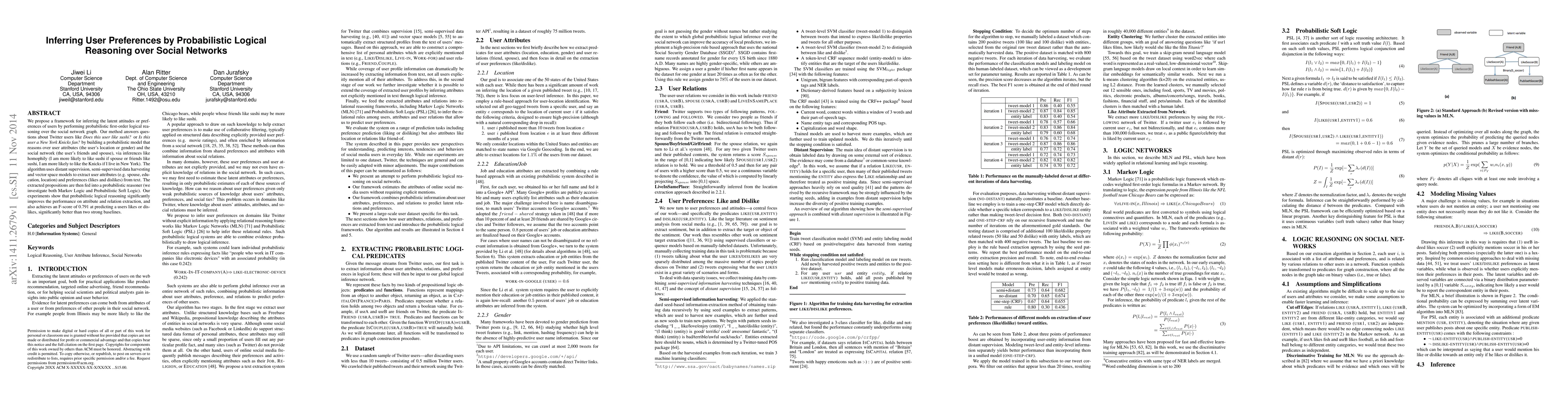 This paper proposes a framework for inferring users' preferences by performing probabilistic logical reasoning over social networks, achieving an F-score of 0.791. It uses probabilistic models and logical reasoning to extract and reason about user attributes and social connections, significantly outperforming baseline methods.