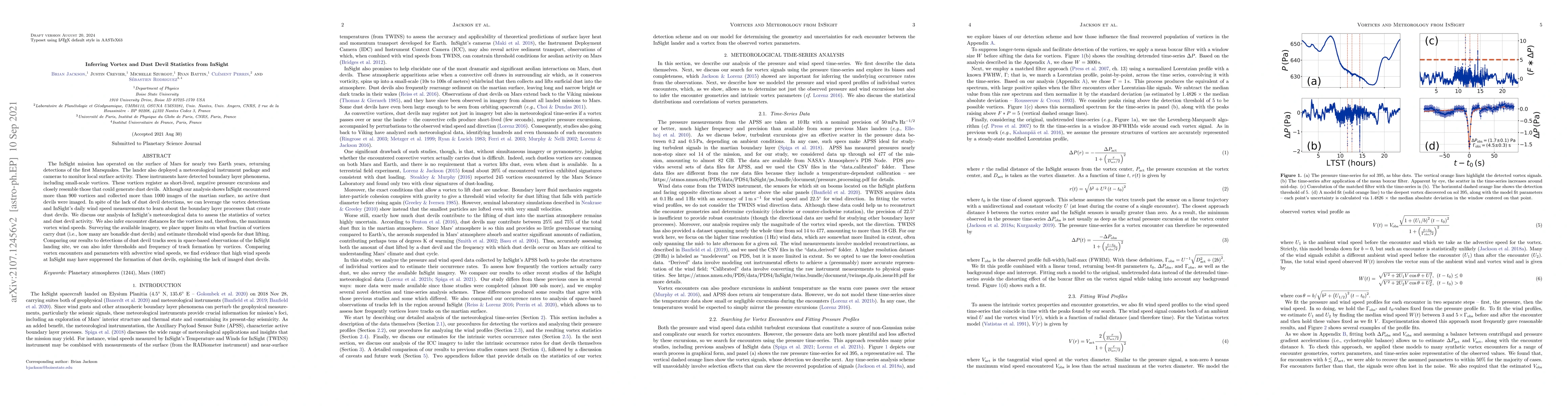 The InSight mission detected over 900 vortices on Mars but no active dust devils, despite capturing over 1000 surface images. Analysis of InSight's meteorological data reveals insights into vortex and dust devil statistics, suggesting high wind speeds may have suppressed dust devil formation.