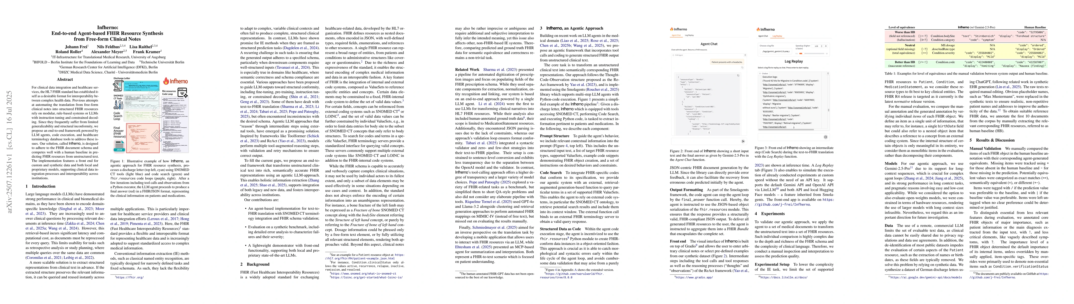 For clinical data integration and healthcare services, the HL7 FHIR standard has established itself as a desirable format for interoperability between complex health data. Previous attempts at automating the translation from free-form clinical notes into structured FHIR resources rely on modular, rule-based systems or LLMs with instruction tuning and constrained decoding. Since they frequently suffer from limited generalizability and structural inconformity, we propose an end-to-end framework powered by LLM agents, code execution, and healthcare terminology database tools to address these issues. Our solution, called Infherno, is designed to adhere to the FHIR document schema and competes well with a human baseline in predicting FHIR resources from unstructured text. The implementation features a front end for custom and synthetic data and both local and proprietary models, supporting clinical data integration processes and interoperability across institutions.