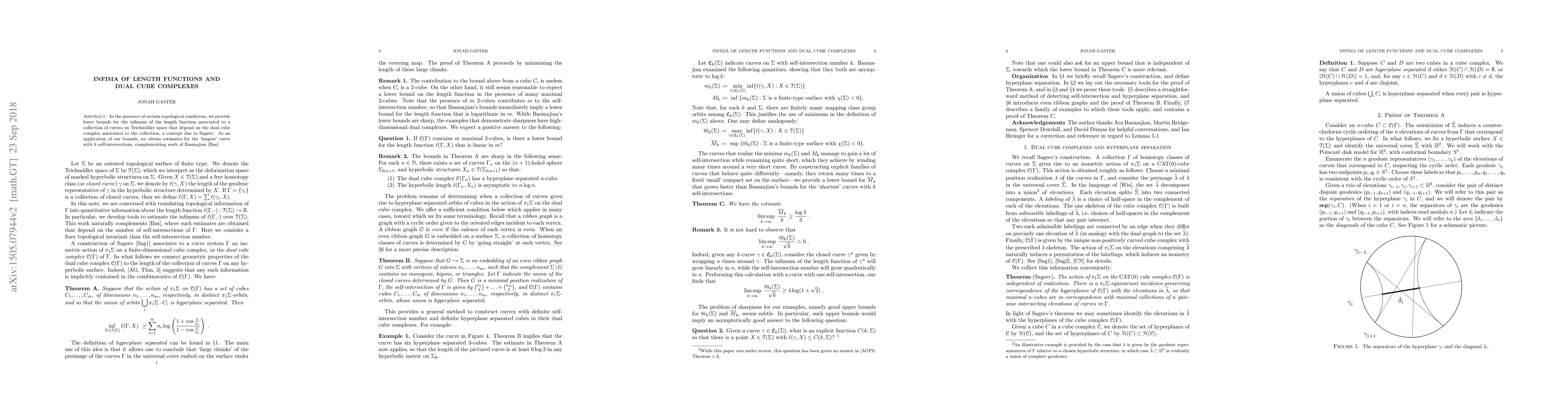This paper establishes lower bounds for the infimum of length functions on Teichmüller space, contingent on topological conditions and the dual cube complex concept by Sageev. It also provides estimates for the longest curve with a specified number of self-intersections, extending Basmajian's prior work.