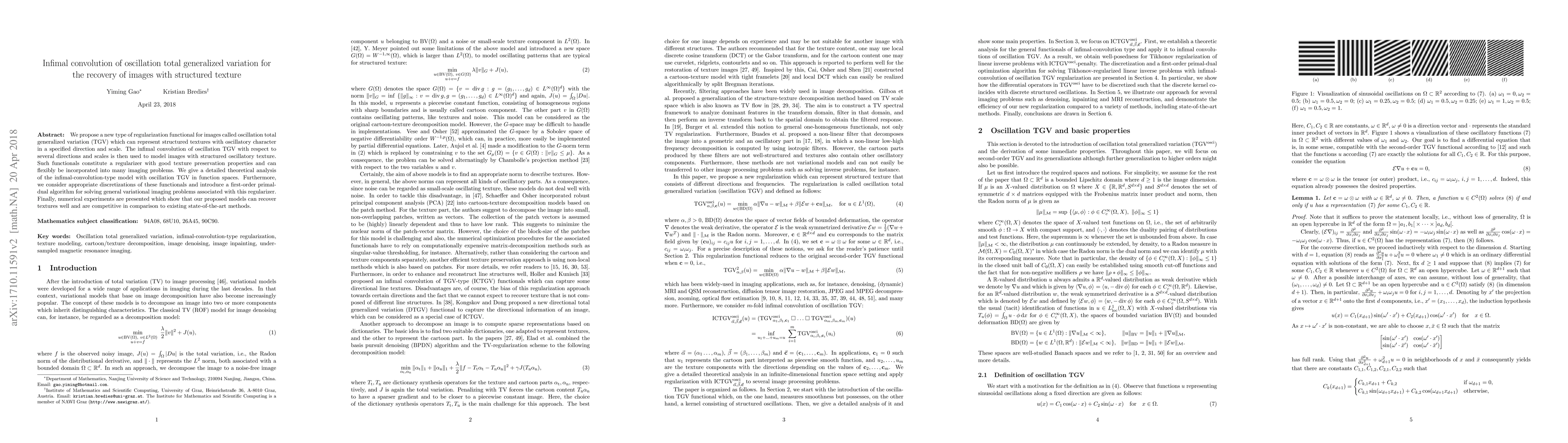 We propose a new type of regularization functional for images called oscillation total generalized variation (TGV) which can represent structured textures with oscillatory character in a specified direction and scale. The infimal convolution of oscillation TGV with respect to several directions and scales is then used to model images with structured oscillatory texture. Such functionals constitute a regularizer with good texture preservation properties and can flexibly be incorporated into many imaging problems. We give a detailed theoretical analysis of the infimal-convolution-type model with oscillation TGV in function spaces. Furthermore, we consider appropriate discretizations of these functionals and introduce a first-order primal-dual algorithm for solving general variational imaging problems associated with this regularizer. Finally, numerical experiments are presented which show that our proposed models can recover textures well and are competitive in comparison to existing state-of-the-art methods.
