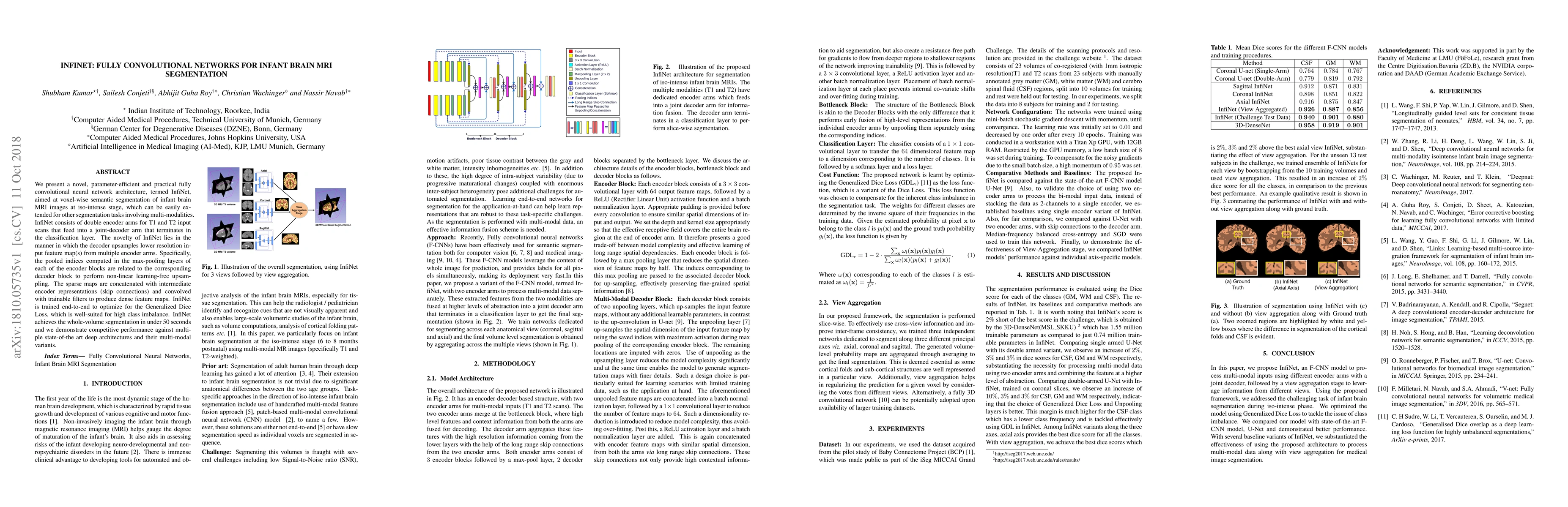 InfiNet is a parameter-efficient fully convolutional neural network designed for voxel-wise segmentation of infant brain MRI images, utilizing separate encoder arms for T1 and T2 scans and a joint decoder for upsampling. It achieves competitive performance and whole-volume segmentation in under 50 seconds.