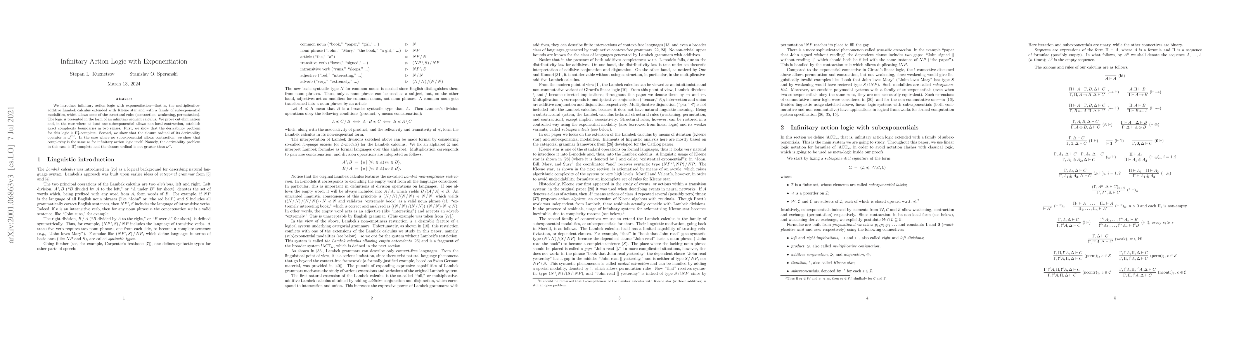 This paper introduces an infinitary action logic with exponentiation, extending the multiplicative-additive Lambek calculus with Kleene star and subexponential modalities. The authors present an infinitary sequent calculus for this logic, prove cut elimination, and establish complexity results including $\Pi_1^1$-completeness and $\omega_1^{\mathrm{CK}}$ closure ordinal under certain conditions.