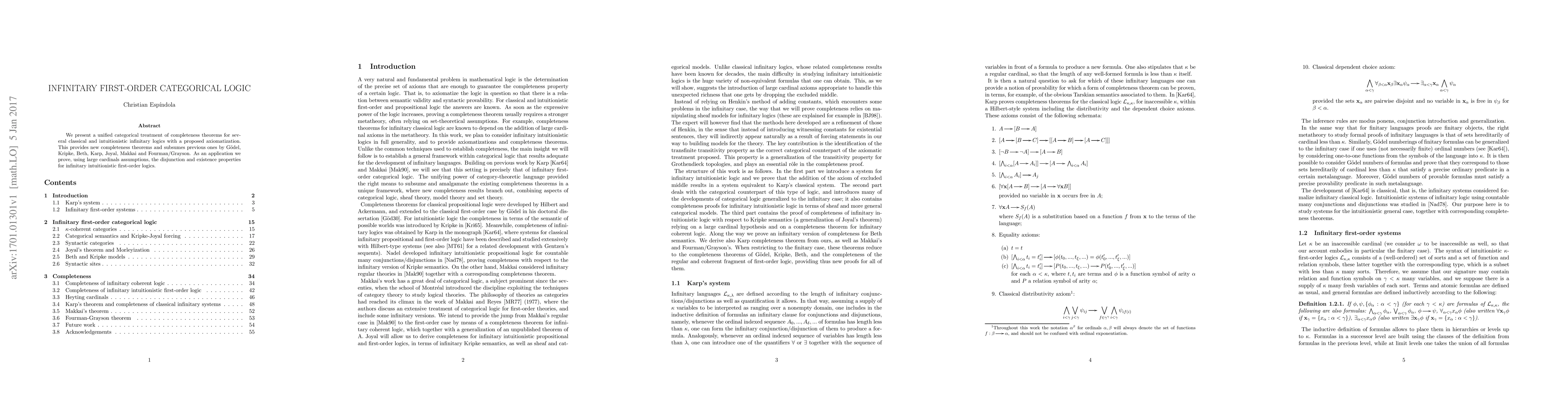 The paper introduces a novel axiomatization and completeness proofs for infinitary logics, unifying and extending previous results through a categorical approach.