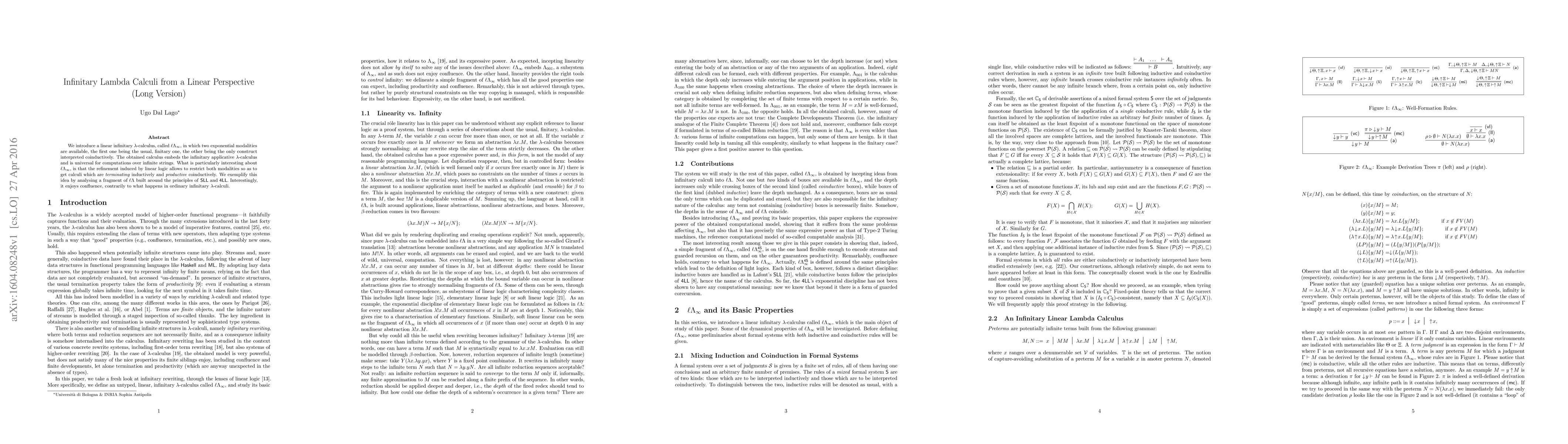 We introduce a linear infinitary $\lambda$-calculus, called $\ell\Lambda_{\infty}$, in which two exponential modalities are available, the first one being the usual, finitary one, the other being the only construct interpreted coinductively. The obtained calculus embeds the infinitary applicative $\lambda$-calculus and is universal for computations over infinite strings. What is particularly interesting about $\ell\Lambda_{\infty}$, is that the refinement induced by linear logic allows to restrict both modalities so as to get calculi which are terminating inductively and productive coinductively. We exemplify this idea by analysing a fragment of $\ell\Lambda$ built around the principles of $\mathsf{SLL}$ and $\mathsf{4LL}$. Interestingly, it enjoys confluence, contrarily to what happens in ordinary infinitary $\lambda$-calculi.