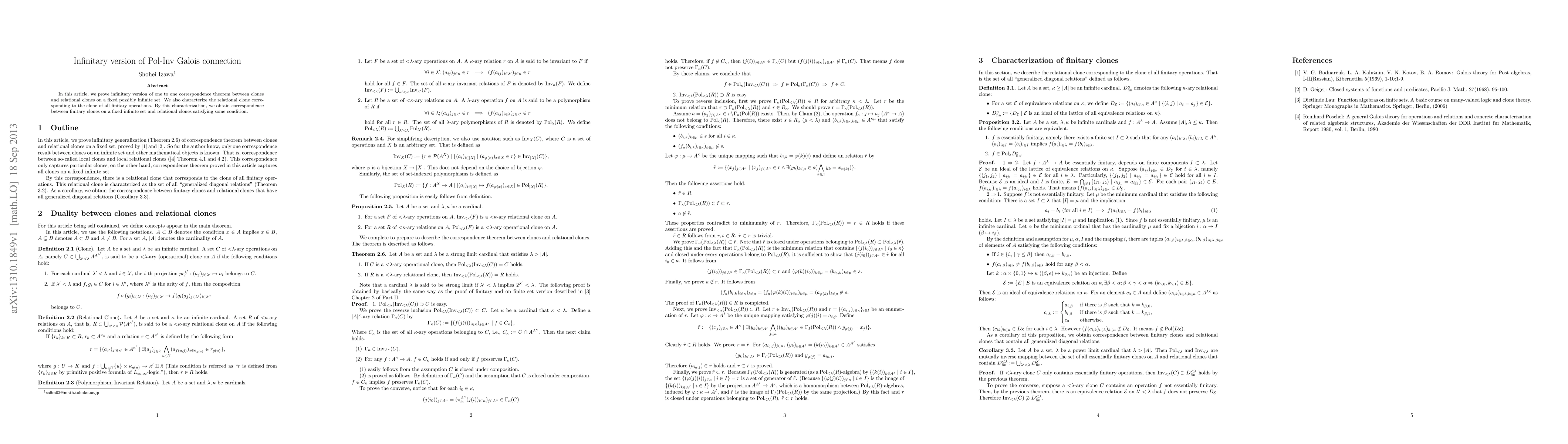 In this article, we prove infinitary version of one to one correspondence theorem between clones and relational clones on a fixed possibly infinite set. We also characterize the relational clone corresponding to the clone of all finitary operations. By this characterization, we obtain correspondence between finitary clones on a fixed infinite set and relational clones satisfying some condition.