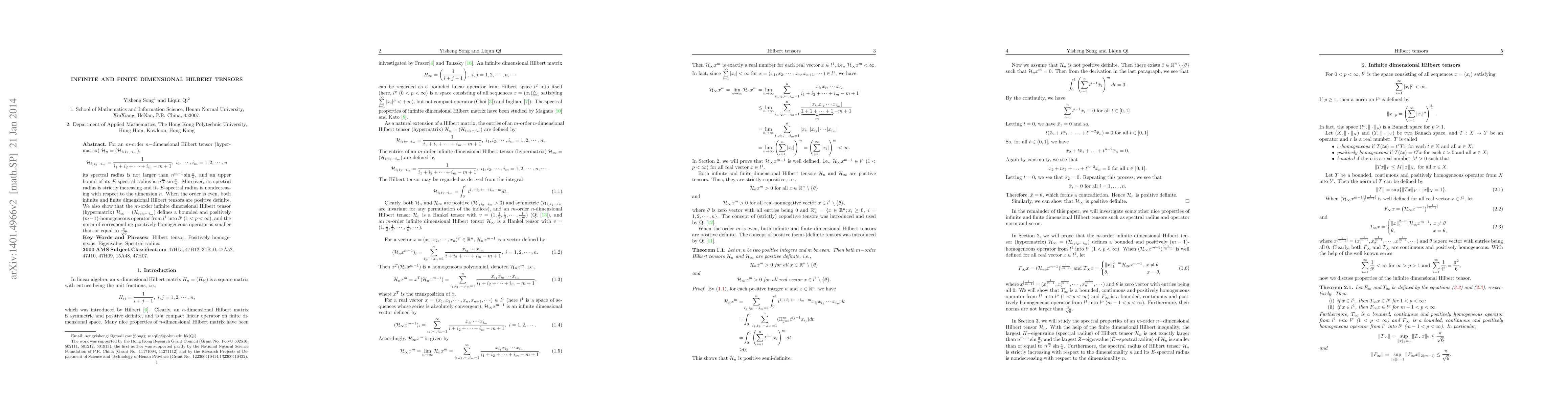 For an $m$-order $n-$dimensional Hilbert tensor (hypermatrix) $\mathcal{H}_n=(\mathcal{H}_{i_1i_2\cdots i_m})$, $$\mathcal{H}_{i_1i_2\cdots i_m}=\frac1{i_1+i_2+\cdots+i_m-m+1},\ i_1,\cdots, i_m=1,2,\cdots,n$$ its spectral radius is not larger than $n^{m-1}\sin\frac{\pi}{n}$, and an upper bound of its $E$-spectral radius is $n^{\frac{m}2}\sin\frac{\pi}{n}$. Moreover, its spectral radius is strictly increasing and its $E$-spectral radius is nondecreasing with respect to the dimension $n$. When the order is even, both infinite and finite dimensional Hilbert tensors are positive definite. We also show that the $m$-order infinite dimensional Hilbert tensor (hypermatrix) $\mathcal{H}_\infty=(\mathcal{H}_{i_1i_2\cdots i_m})$ defines a bounded and positively $(m-1)$-homogeneous operator from $l^1$ into $l^p$ ($1