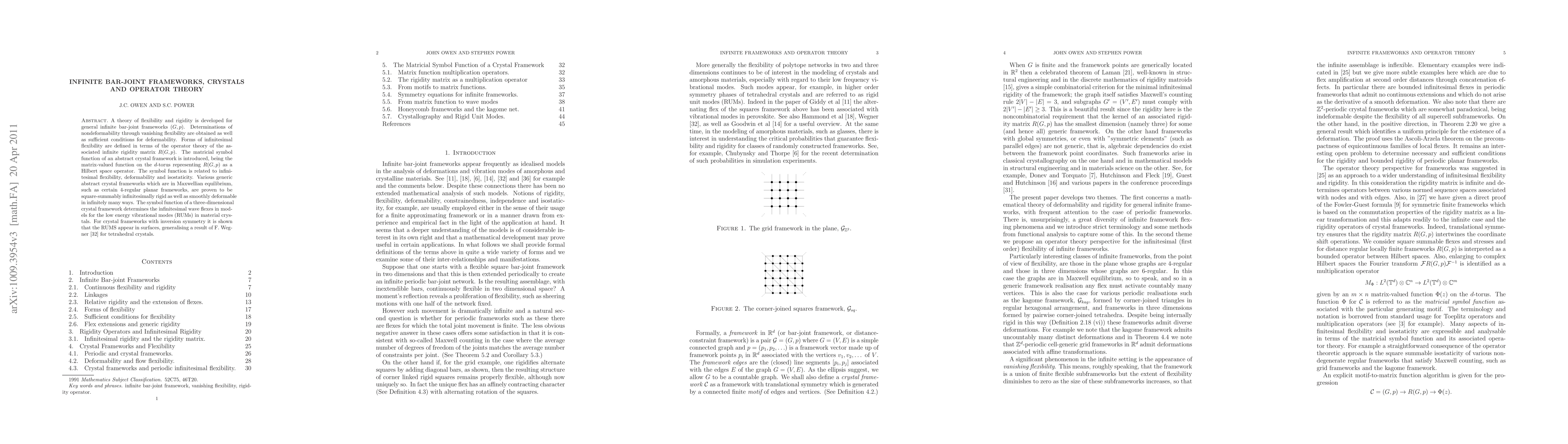 Researchers developed a theory of flexibility and rigidity for infinite bar-joint frameworks, introducing a matrix-valued function that relates to infinitesimal flexibility and deformability. This framework has implications for understanding crystal structures and low-energy vibrational modes in materials.