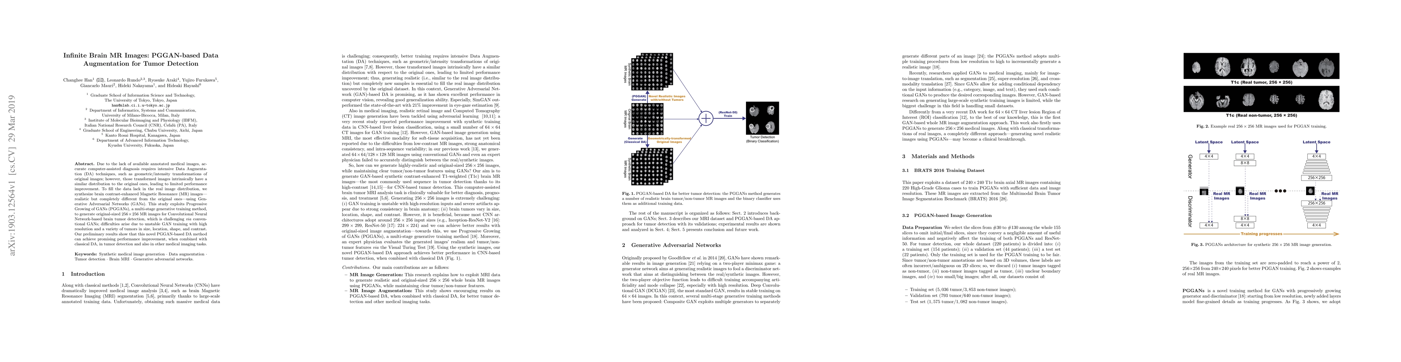 This paper proposes using Progressive Growing of GANs (PGGANs) to synthesize realistic brain MR images for data augmentation, addressing the scarcity of annotated medical images. The study demonstrates that PGGAN-based augmentation, combined with classical methods, significantly enhances brain tumor detection performance.