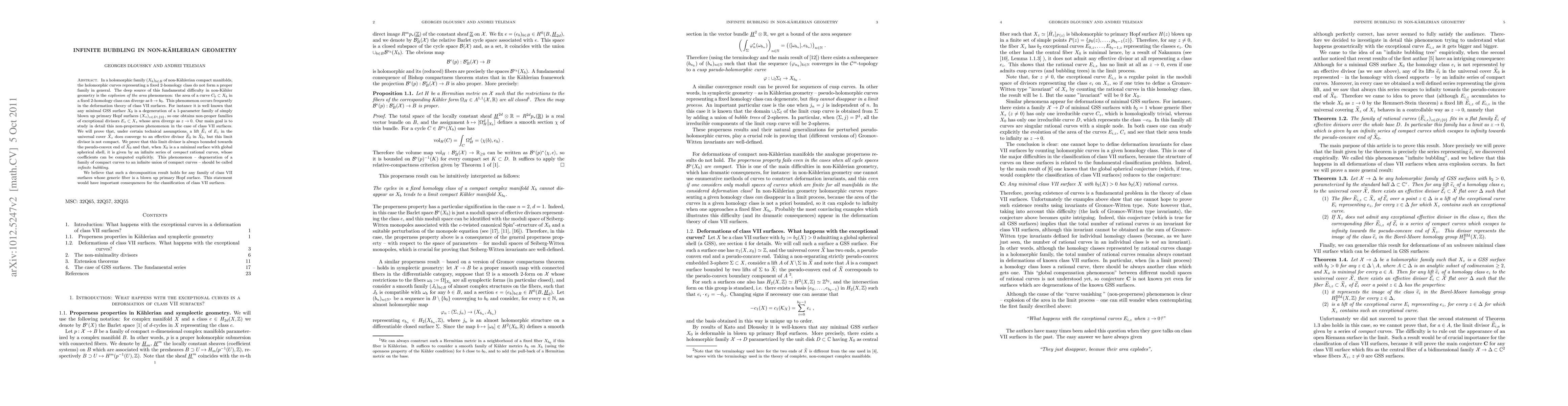 In a holomorphic family $(X_b)_{b\in B}$ of non-K\"ahlerian compact manifolds, the holomorphic curves representing a fixed 2-homology class do not form a proper family in general. The deep source of this fundamental difficulty in non-K\"ahler geometry is the {\it explosion of the area} phenomenon: the area of a curve $C_b\subset X_b$ in a fixed 2-homology class can diverge as $b\to b_0$. This phenomenon occurs frequently in the deformation theory of class VII surfaces. For instance it is well known that any minimal GSS surface $X_0$ is a degeneration of a 1-parameter family of simply blown up primary Hopf surfaces $(X_z)_{z\in D\setminus\{0\}}$, so one obtains non-proper families of exceptional divisors $E_z\subset X_z$ whose area diverge as $z\to 0$. Our main goal is to study in detail this non-properness phenomenon in the case of class VII surfaces. We will prove that, under certain technical assumptions, a lift $\widetilde E_z$ of $E_z$ in the universal cover $\widetilde X_z$ does converge to an effective divisor $\widetilde E_0$ in $\widetilde X_0$, but this limit divisor is not compact. We prove that this limit divisor is always bounded towards the pseudo-convex end of $\widetilde X_0$ and that, when $X_0$ is a a minimal surface with global spherical shell, it is given by an infinite series of {\it compact} rational curves, whose coefficients can be computed explicitly. This phenomenon - degeneration of a family of compact curves to an infinite union of compact curves - should be called {\it infinite bubbling}. We believe that such a decomposition result holds for any family of class VII surfaces whose generic fiber is a blown up primary Hopf surface. This statement would have important consequences for the classification of class VII surfaces.