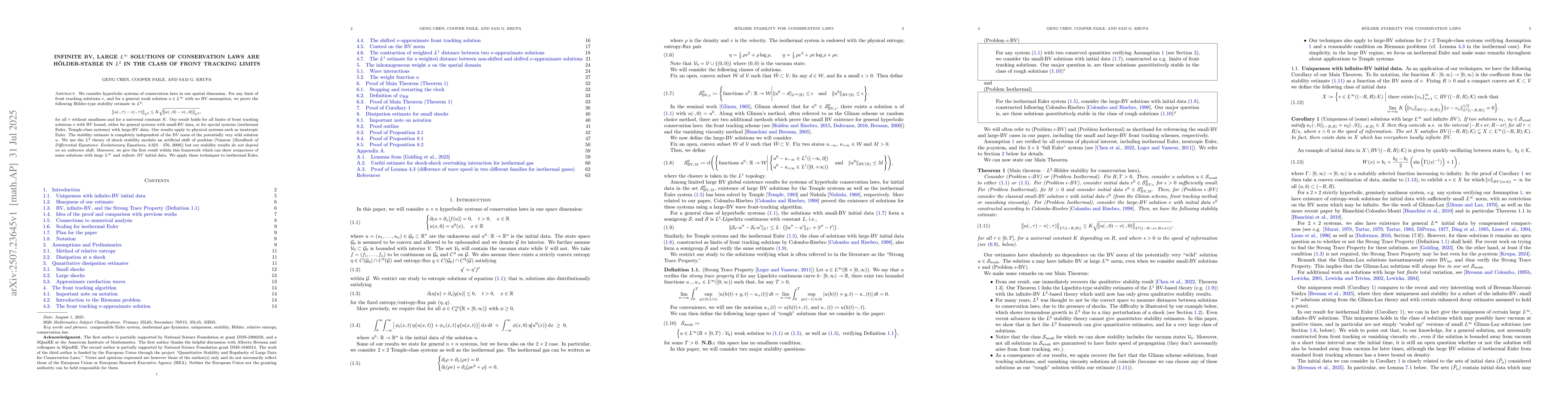 We consider hyperbolic systems of conservation laws in one spatial dimension. For any limit of front tracking solutions $v$, and for a general weak solution $u\in L^\infty$ with no BV assumption, we prove the following H\"older-type stability estimate in $L^2$: $$||u(\cdot,\tau)-v(\cdot,\tau)||_{L^2} \leq K \sqrt{||u( \cdot,0)-v( \cdot,0)||_{L^2}}$$ for all $\tau$ without smallness and for a universal constant $K$. Our result holds for all limits of front tracking solutions $v$ with BV bound, either for general systems with small-BV data, or for special systems (isothermal Euler, Temple-class systems) with large-BV data. Our results apply to physical systems such as isentropic Euler. The stability estimate is completely independent of the BV norm of the potentially very wild solution $u$. We use the $L^2$ theory of shock stability modulo an artificial shift of position (Vasseur [Handbook of Differential Equations: Evolutionary Equations, 4:323 -- 376, 2008]) but our stability results do not depend on an unknown shift. Moreover, we give the first result within this framework which can show uniqueness of some solutions with large $L^\infty$ and infinite BV initial data. We apply these techniques to isothermal Euler.